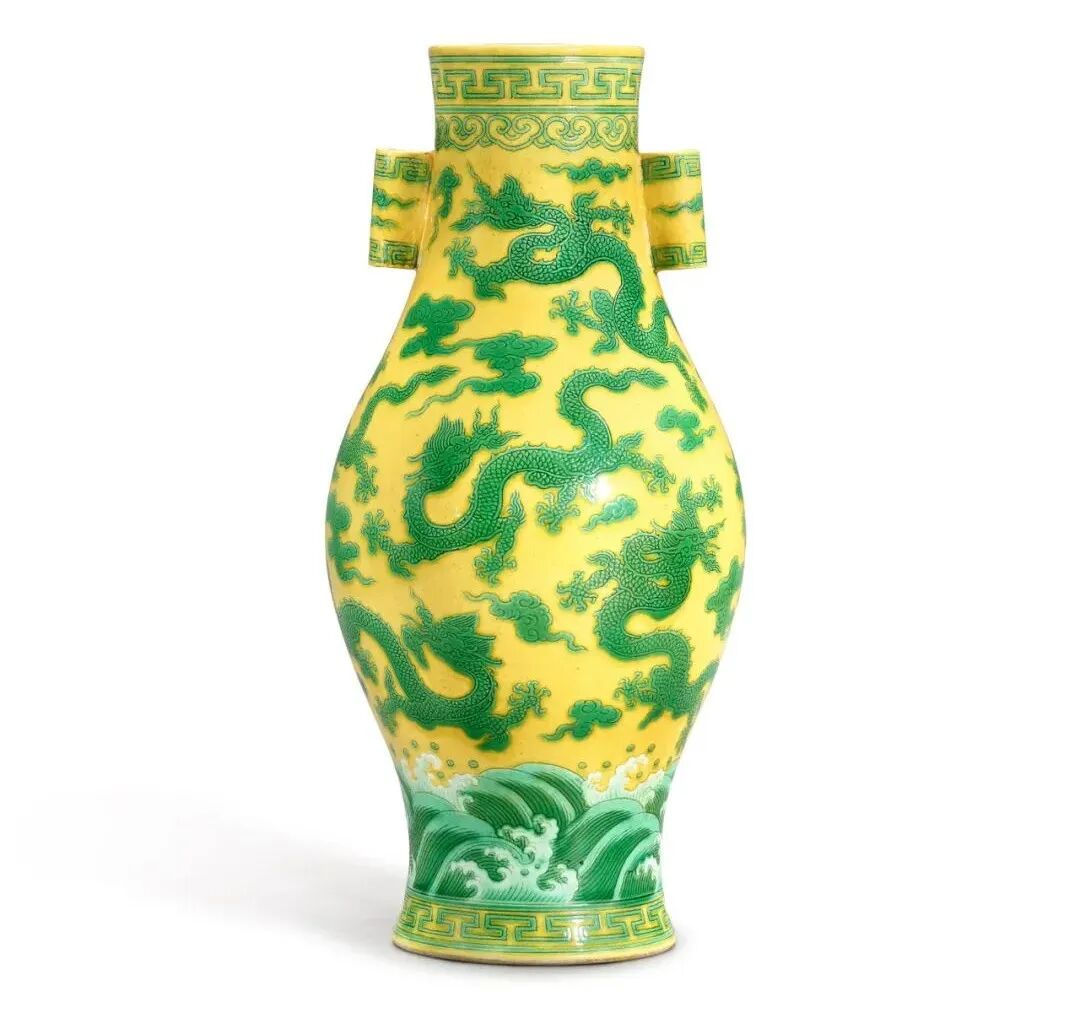 清雍正 黄地绿彩海水云龙双贯耳橄榄瓶 高30.5cm