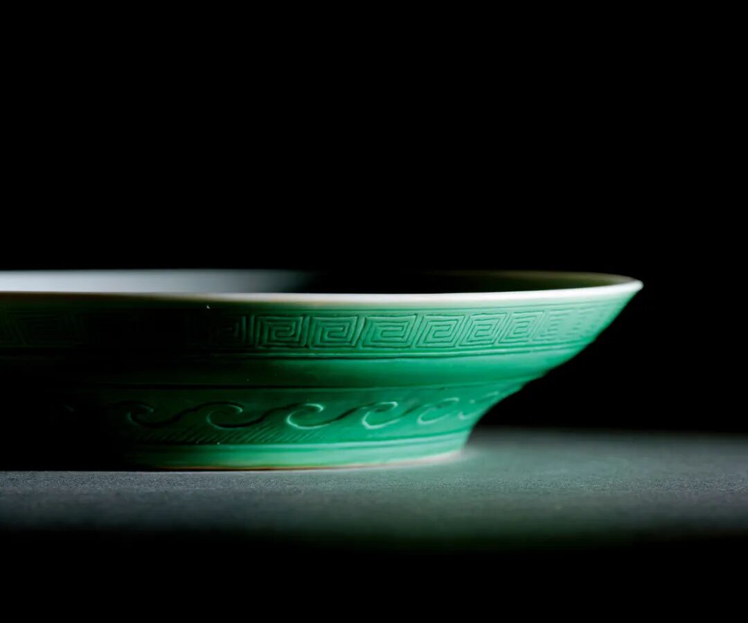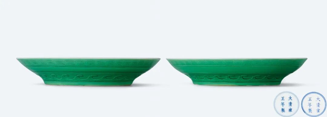 清雍正 湖水绿釉雕刻海浪纹盘一对