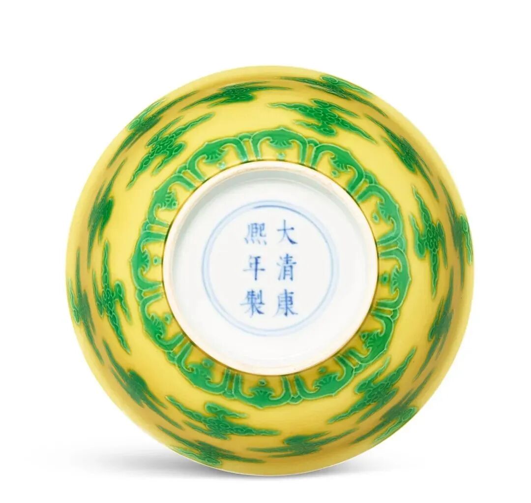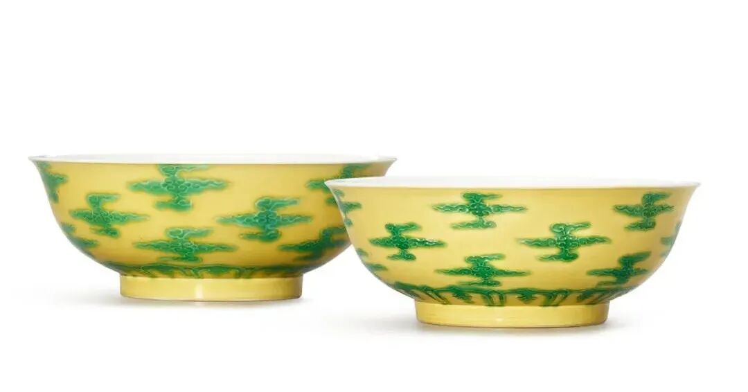 清康熙 黄地绿彩祥云纹盌一对 13.2cm