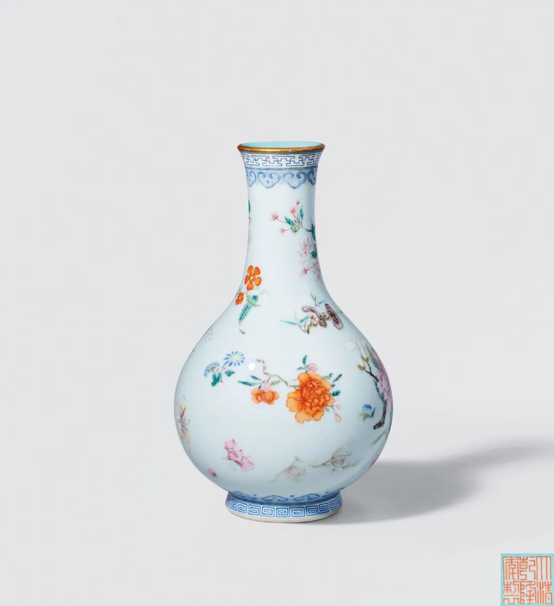 另一精选是同属艾弗瑞 · 莫里森宝蓄的清乾隆洋彩粉地蝴蝶瓶一对。此对瓶纹饰秀丽,施明艳粉地,带西方风格,绘蝶舞花间,缤纷绚烂,烧制一丝不苟,美不胜收。