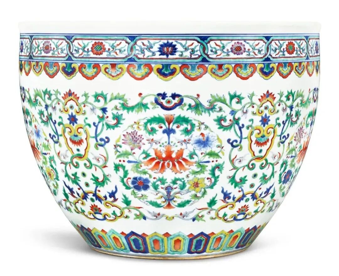 清嘉庆 斗彩团花卷草纹缸 33.8cm