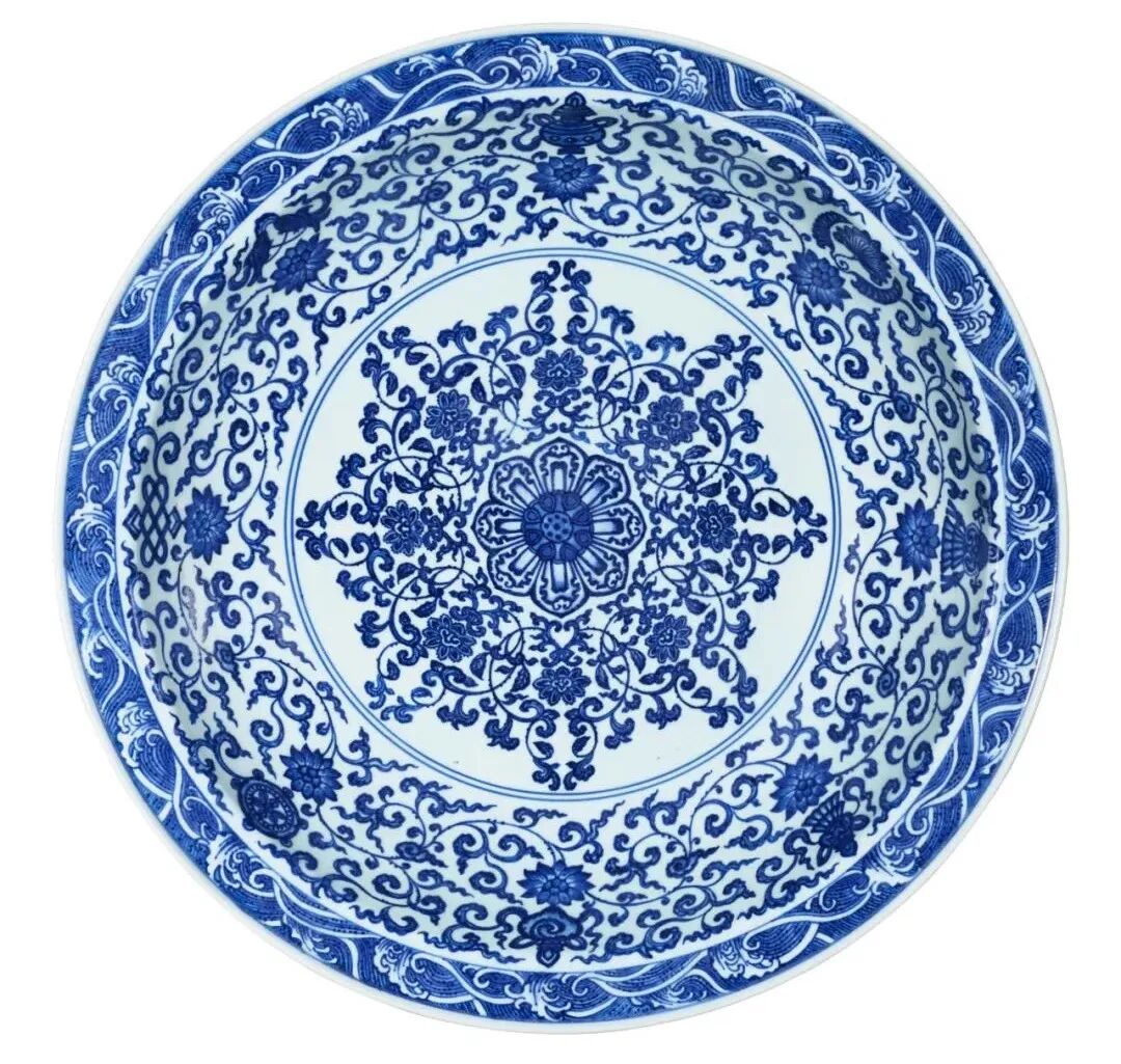 清雍正 青花宝相花莲托八吉祥纹折沿大盘