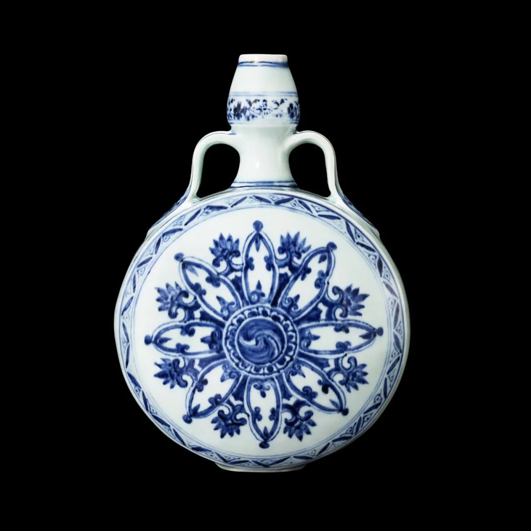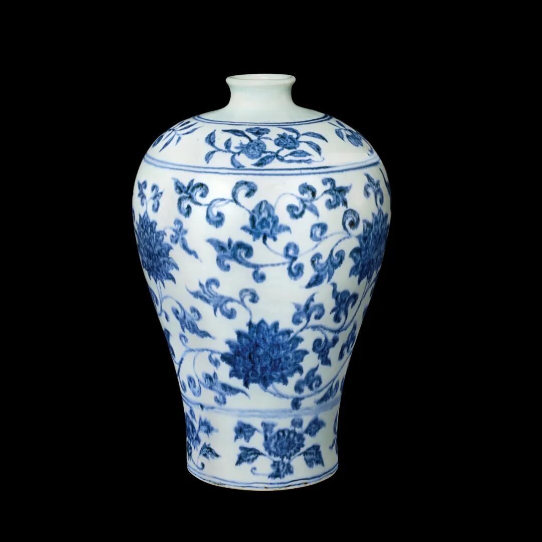 莲纹梅瓶自景德镇产青花瓷以来便有烧造,然其中经典非永乐(1403—1424年)莫属。因宫廷督造,永乐梅瓶集前朝之大成,无论器形、纹饰,皆一丝不苟。明初永乐垂范后世,青花瓷于此朝登峰造极。青花缠枝莲纹梅瓶广受青睐,除两岸故宫外,中东皇室亦有收藏。此梅瓶钴青代墨妙绘莲,运笔修饰花叶微末之处,缠枝牵绕花蓬,疏密错落,飘曳蜿蜒,当属明初典范。