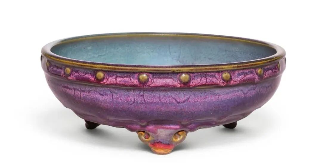 明初 钧窰葡萄紫釉鼓钉三足水仙盆 底刻“五”字