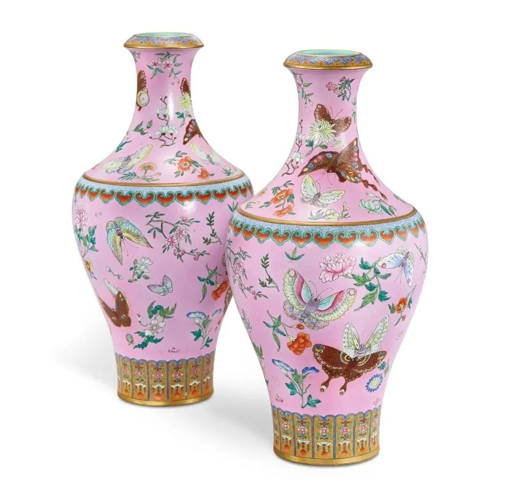 清乾隆 洋彩粉地蝴蝶瓶一对 高47cm