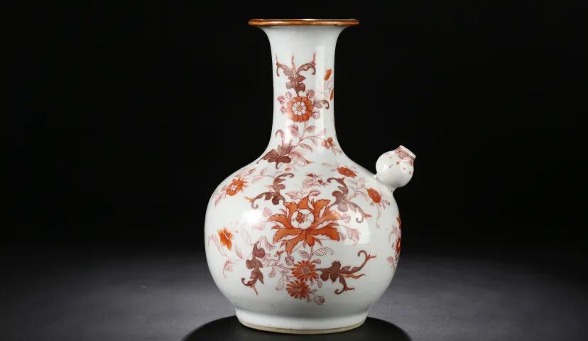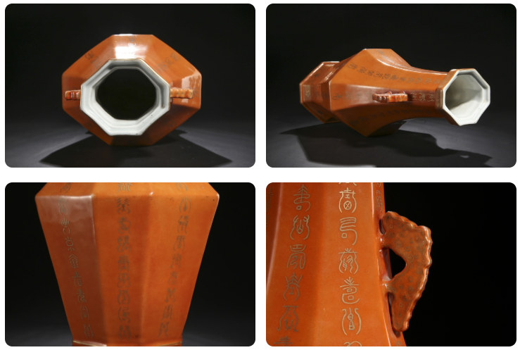 民国·珊瑚红釉描金万寿纹双耳八方瓶