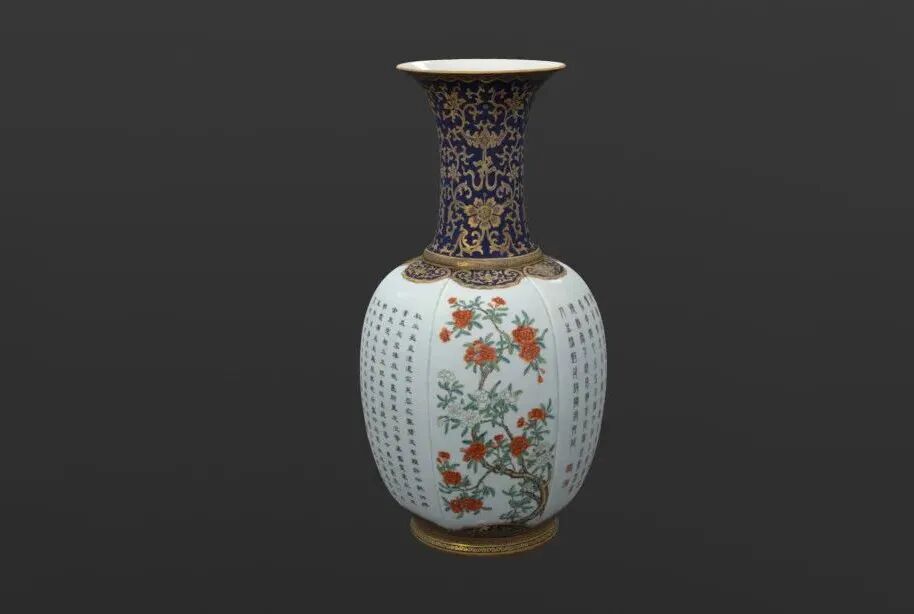 清 霁蓝地描金粉彩诗句花卉纹大瓶