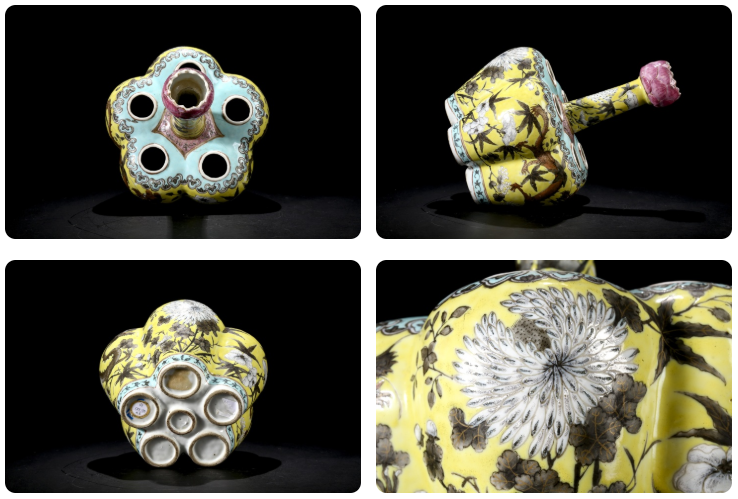描述:保真卡号:617111 此件晚清·大雅斋风格黄地墨彩穿花龙纹五孔瓶,以五小罐围绕周身,中为一莲花口型竖直大管,下承六只小圈足,对应上面六管。器身作大雅斋器风格,主体以黄彩铺地,以墨彩绘穿花龙纹,纹饰描画细腻,彩绘流畅,纹饰吉祥,倍显华贵。