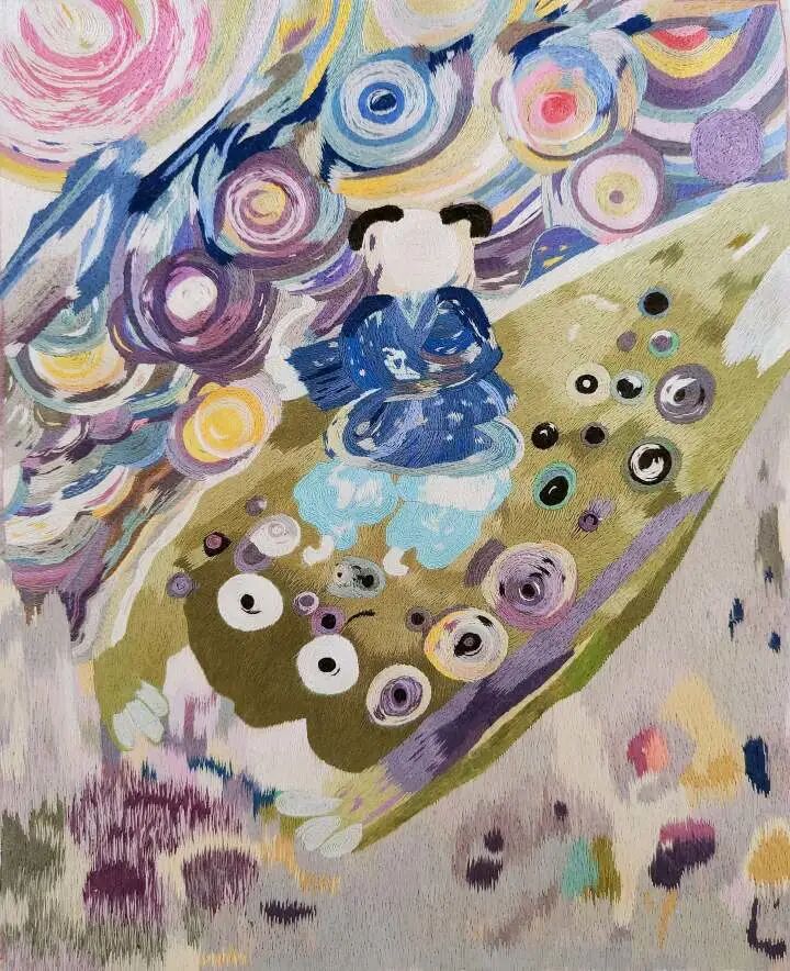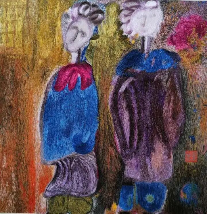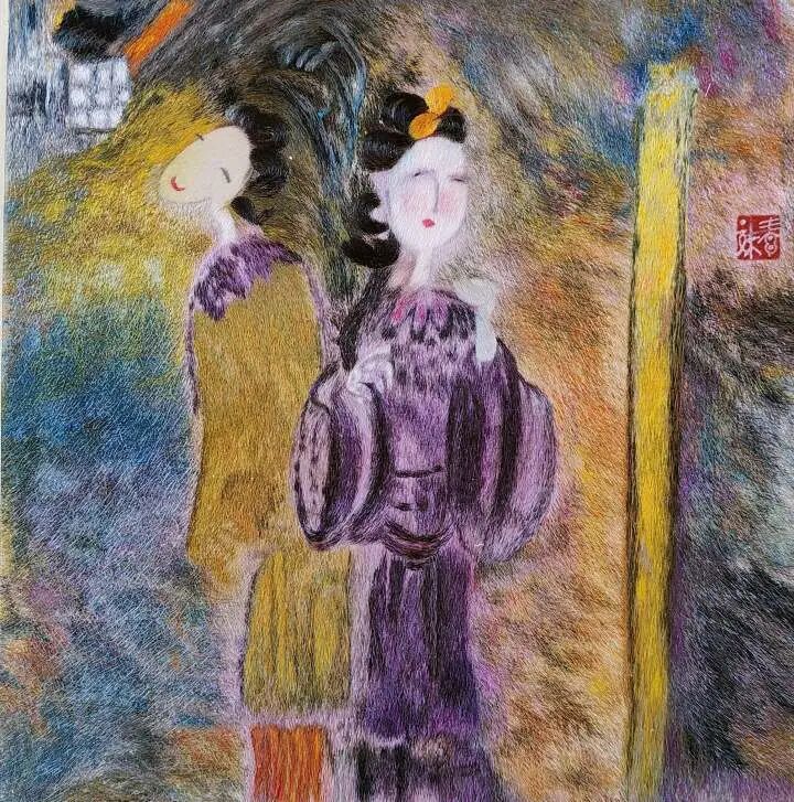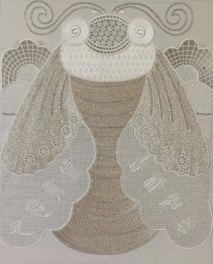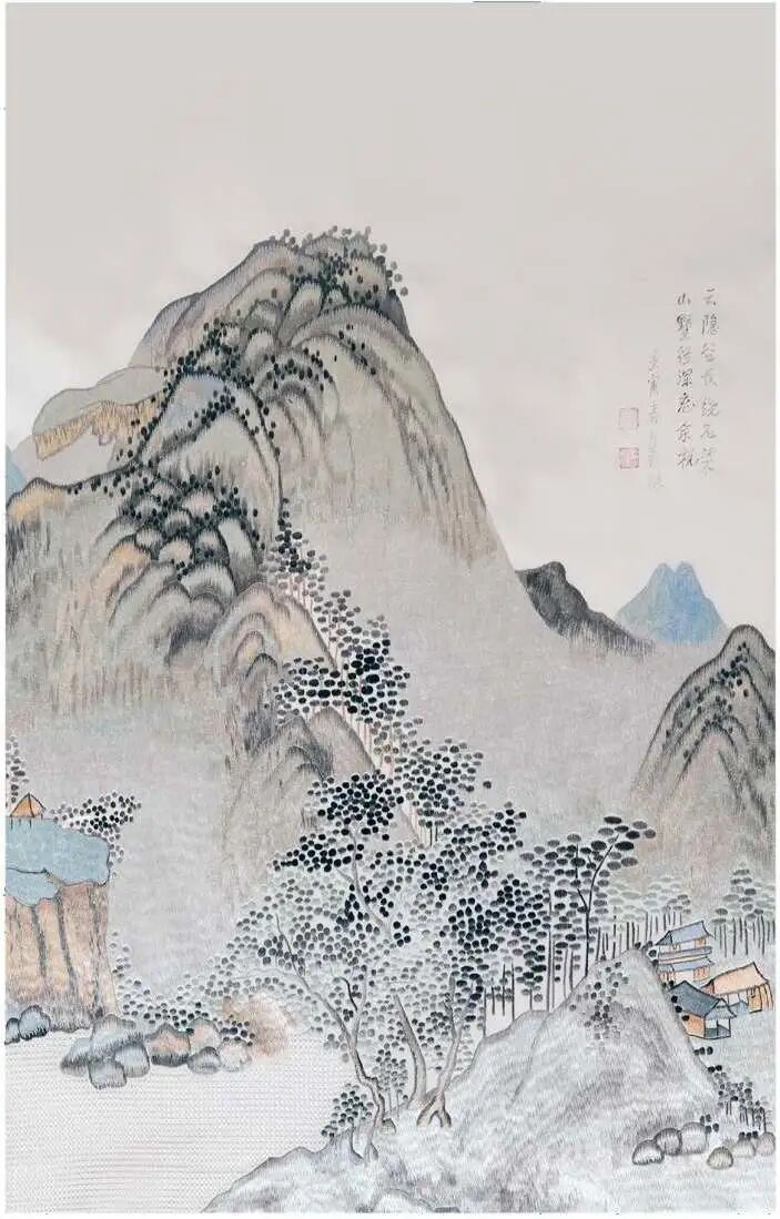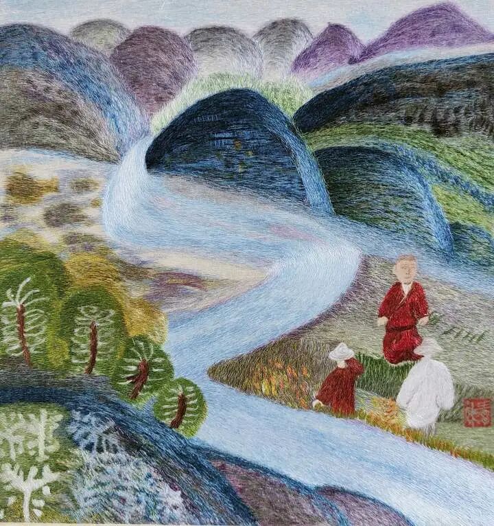 廖春妹对每种针法熟练于心,常发挥出令人意想不到的组合。《人间烟火》系列中,她以随性生动的造型描绘出人物生活场景,用散点加层的铺色手法,表现出流动的彩墨绘画效果。《隐居山水图》灵感来源于中国水墨画,一针针绣出归隐山林的理想意境。她还发掘许多不常用的古老针法,绣制出古朴素雅的《蝉意图》。