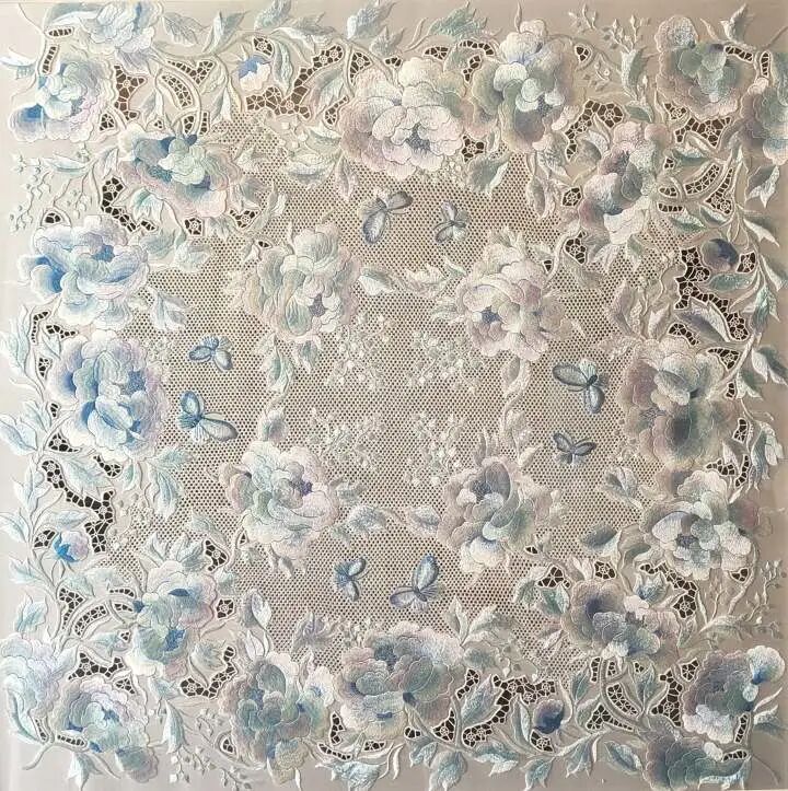 《四海求凰》的牡丹则在雍容中体现出蓝白青花的明净典雅之美。牡丹、凤凰、蝴蝶与青花,寄托了祥瑞吉庆、和美良缘的期望。廖春妹运用掺针、平针、三别针、盖针等针法,使得图案玲珑剔透,还有柔美细腻的光影效果;特制的改良线丝理清晰,且不易起毛,兼顾了艺术性和实用性。