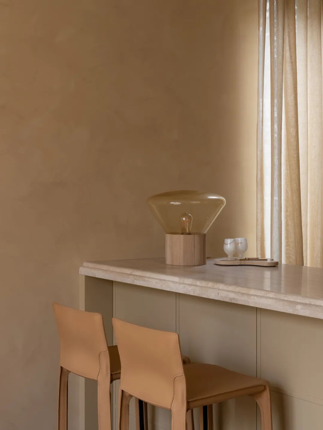 贯穿始终的焦糖色调反映了客户的个性;他们喜欢焦糖色散发的平静感及其细微差别。设计师将色调描述为有意一致深思熟虑的约束,需要极大的控制和对细节的关注。温暖的纹理元素(天然木材和石头)与较冷的金属和玻璃相平衡,营造出一种深度感,触感形式和柔软的家具更加突出。设计师刻意避免刺眼的建筑照明,选择了微妙的壁灯和灯具,以确保空间即使在晚上也能保持氛围。