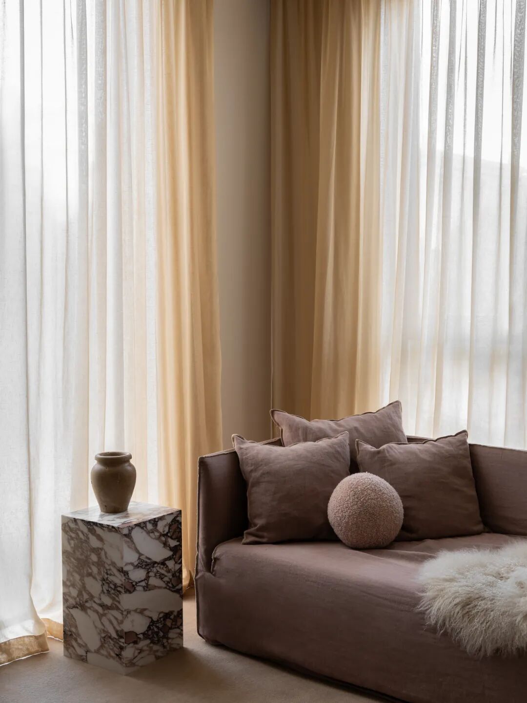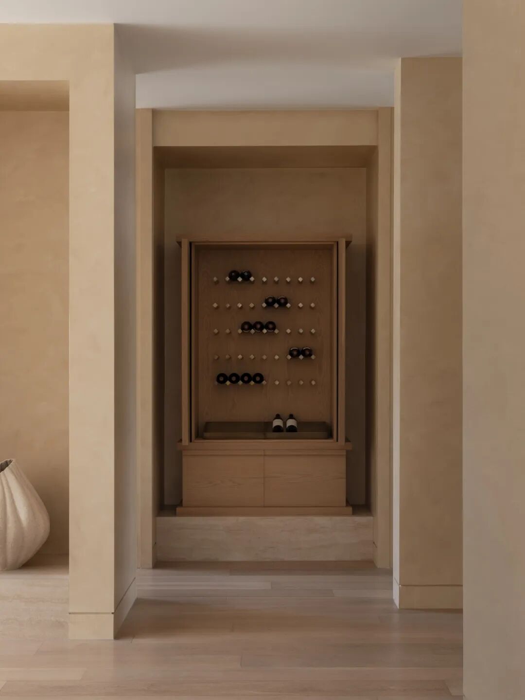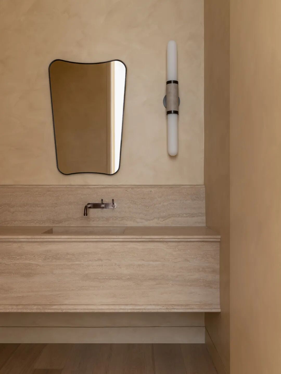 The caramel tones throughout reflect the client's personality; they love the calming feeling that caramel radiates and its nuances. The designers describe the tones as "intentionally consistent" and "thoughtfully restrained," requiring great control and attention to detail. Warm textural elements (natural wood and stone) are balanced with cooler metals and glass to create a sense of depth, accentuated by tactile forms and soft furnishings. The designers deliberately avoided harsh architectural lighting, opting for subtle wall sconces and light fixtures to ensure the space maintains its ambience even at night.