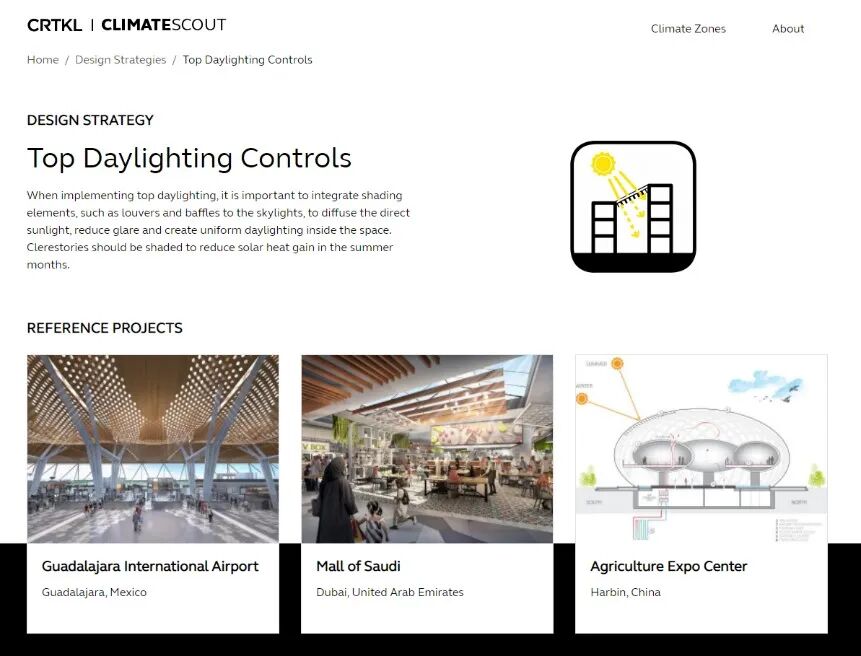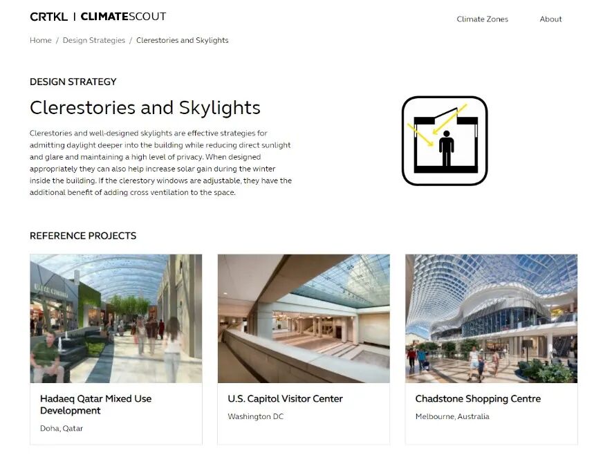 CLIMATESCOUT从建筑层面提供与气候相关的设计建议,帮助建筑师决定与场地相适应的设计方案。为了实现这一目标,它将Köppen-Geiger气候分类与《建筑2030调色板》中的建筑设计策略结合起来。