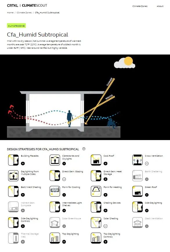 Twenty-seven building scale strategies taken from the 2030 palette are paired with the 30 climate subtypes to determine their applicability for each of the Köppen-Geiger climates. The user can filter out, select, and combine appropriate strategies for a selected climate. As the user selects these curated strategies, they appear in real-time overlaid in diagrammatic form, providing an immediate visual connection between climate and building response.