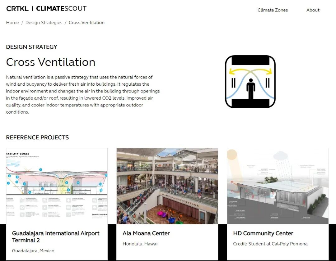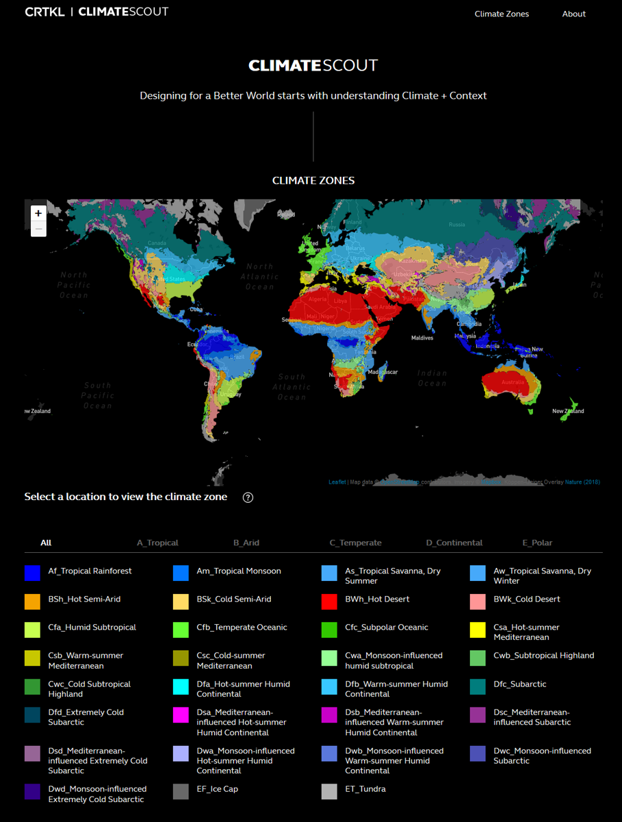 CLIMATESCOUT helps its users design buildings that uniquely respond to a site by providing climate-specific design advice at the building scale. It pairs the Köppen-Geiger climate classification and building design strategies from Architecture 2030's Palette.