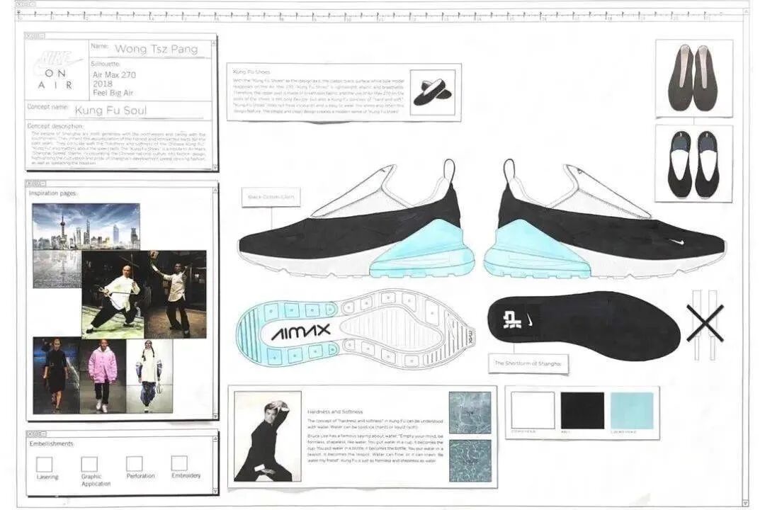 其中来自中国香港的黄子鹏 (Harry Wong) 选择了 Air Max 270 ,并为其注入「Kung Fu Soul」的灵魂,他也凭借这一设计成为上海赛区的三名优胜者之一,作品也被送到 Nike 全球总部进行最终的评选。虽然最终没能突破重围进入最后的量产市售,但他的作品所传达的理念给当时大中华区的评委之一——陈冠希留下了深刻的印象,这也为后续的合作埋下伏笔。