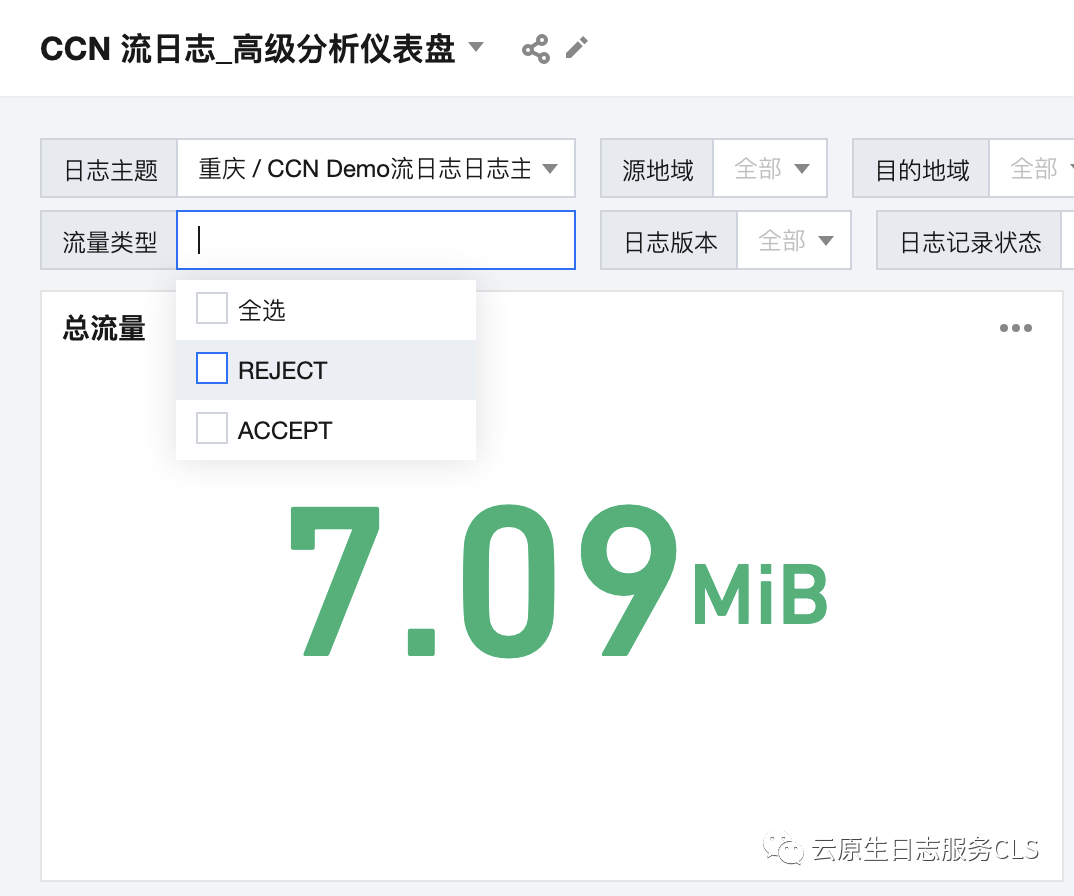 小秦打开 CLS 的 CCN 流日志_高级分析仪表盘,在顶部过滤出流量类型为 REJECT(被拒绝)的流日志。