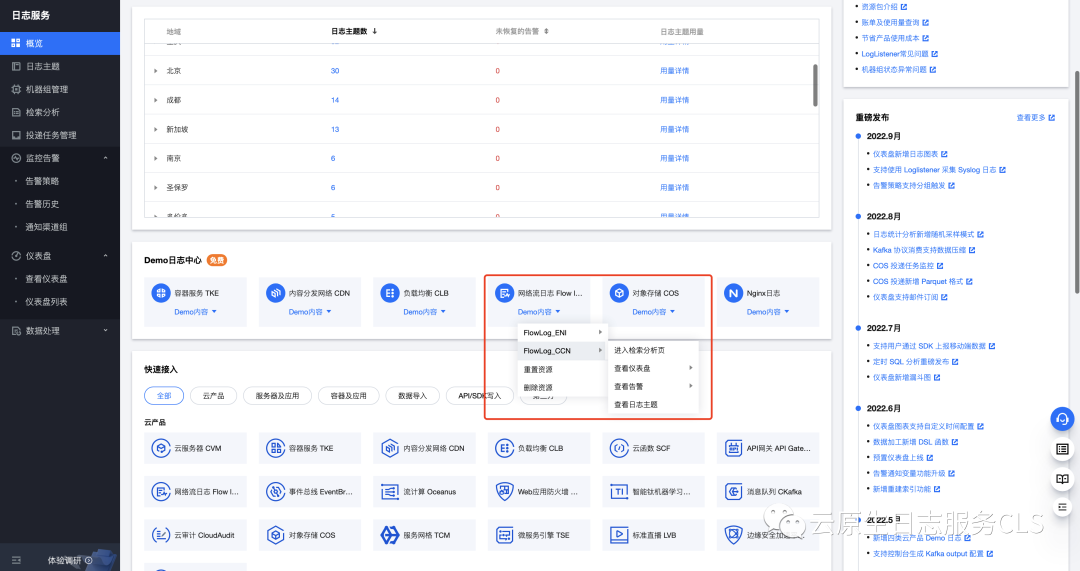 CLS 日志服务提供免费的 CCN 云联网流日志 Demo 快速体验,一键开箱即可使用,全景体验 CCN 检索分析、预置仪表盘、实时告警等功能。