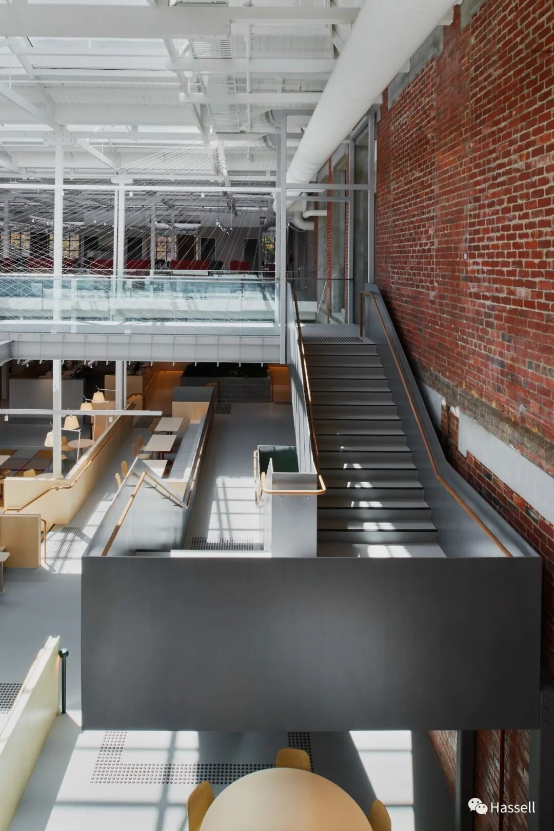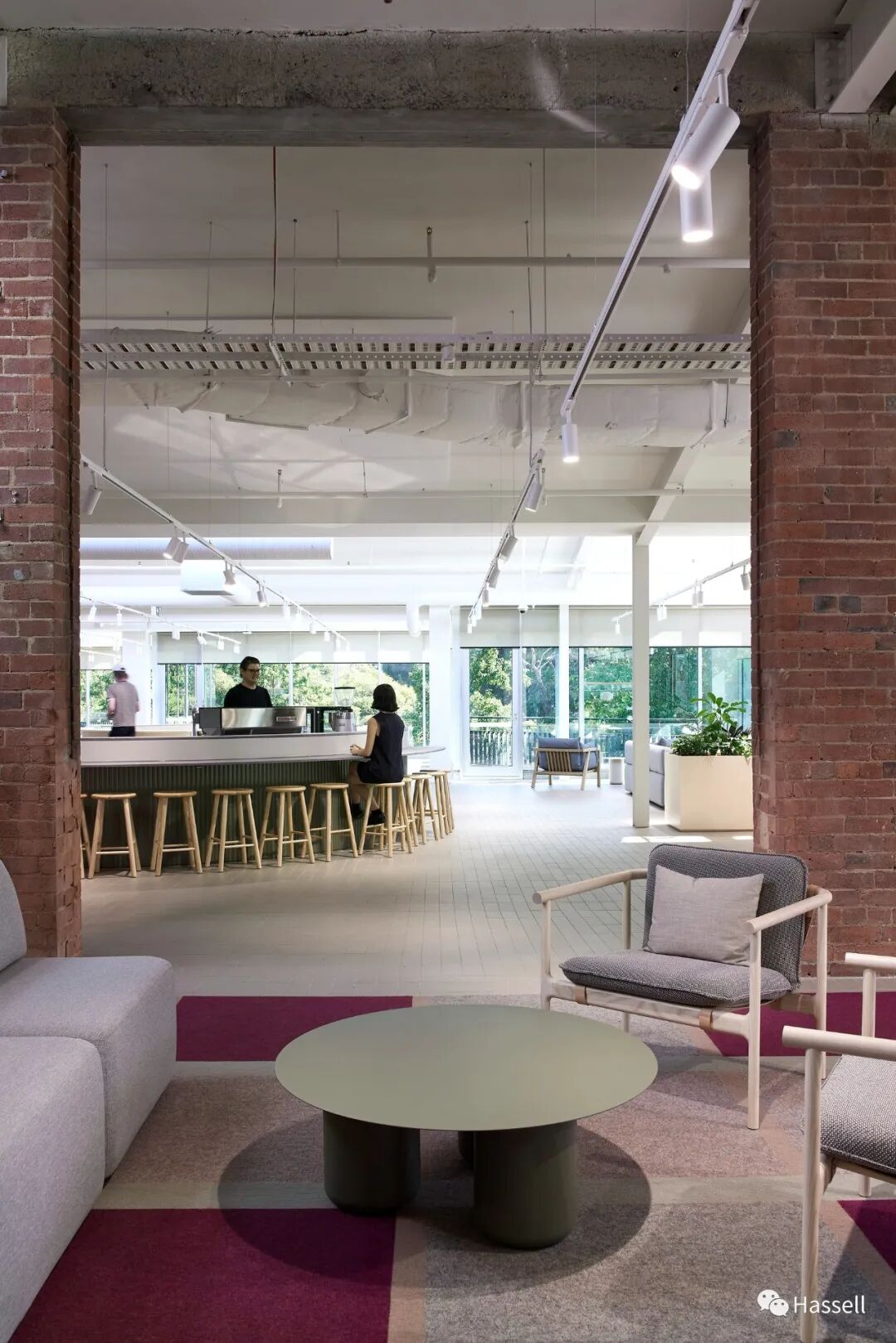 Integrating the large and previously very dark wool mill and an existing 1980s building, the new three level, 7,000 m² workplace is imbued with natural light which is filtered throughout the building via a large central skylight. Distinct zones, each with its own identity and function are unified by a central social space designed for connection and drop in working.