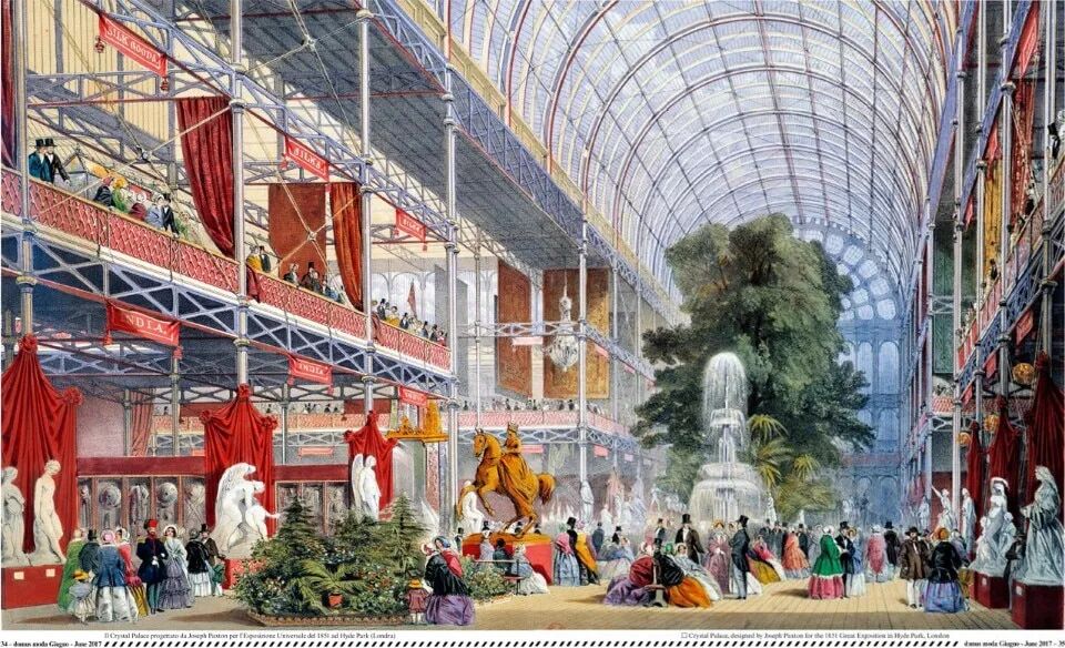 由约瑟夫·帕克斯顿 (Joseph Paxton) 设计的39米高的铁玻璃温室在其92.000平方米的表面上安置了一个强大的风景系统,通过欧文·琼斯的装饰品(琼斯本人在1856年的著作《装饰的语法》中绘制)的相互作用而创建展出了超过100.000件物品,展出的物品从第一个公共厕所到传奇的Koh-l-Noor钻石。