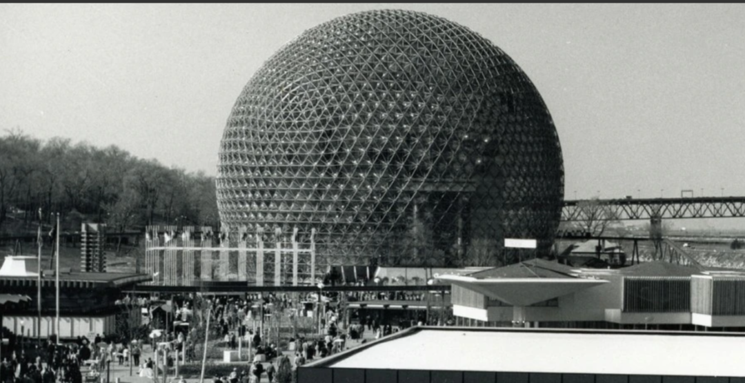 其次是建筑:Frei Otto为德国设计的超大张拉结构,Moshe Safdie设计的作为预制体量的集合的Habitat 67住宅集群,以及整个时代的标志,由Richard Buckminster Fuller为美国馆设计的60米高的测地圆顶,最初包裹在丙烯酸膜内,1976 年在火灾中烧毁后今天作为环境博物馆的永久结构运营.