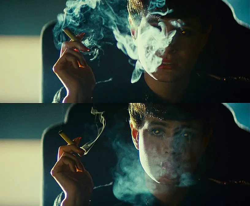 1982年的《银翼杀手》式颓靡再次被提起,复制人瑞秋忧郁而机械地回答一道道测试题,吐出半透明烟雾之后无声地望向镜头,樱桃色唇彩异常纯真,令人恐惧又忍不住想拥抱,恰好撞上千禧年那股魔幻劲头,既恐惧计算机故障,又对突飞的科技蠢蠢欲动。