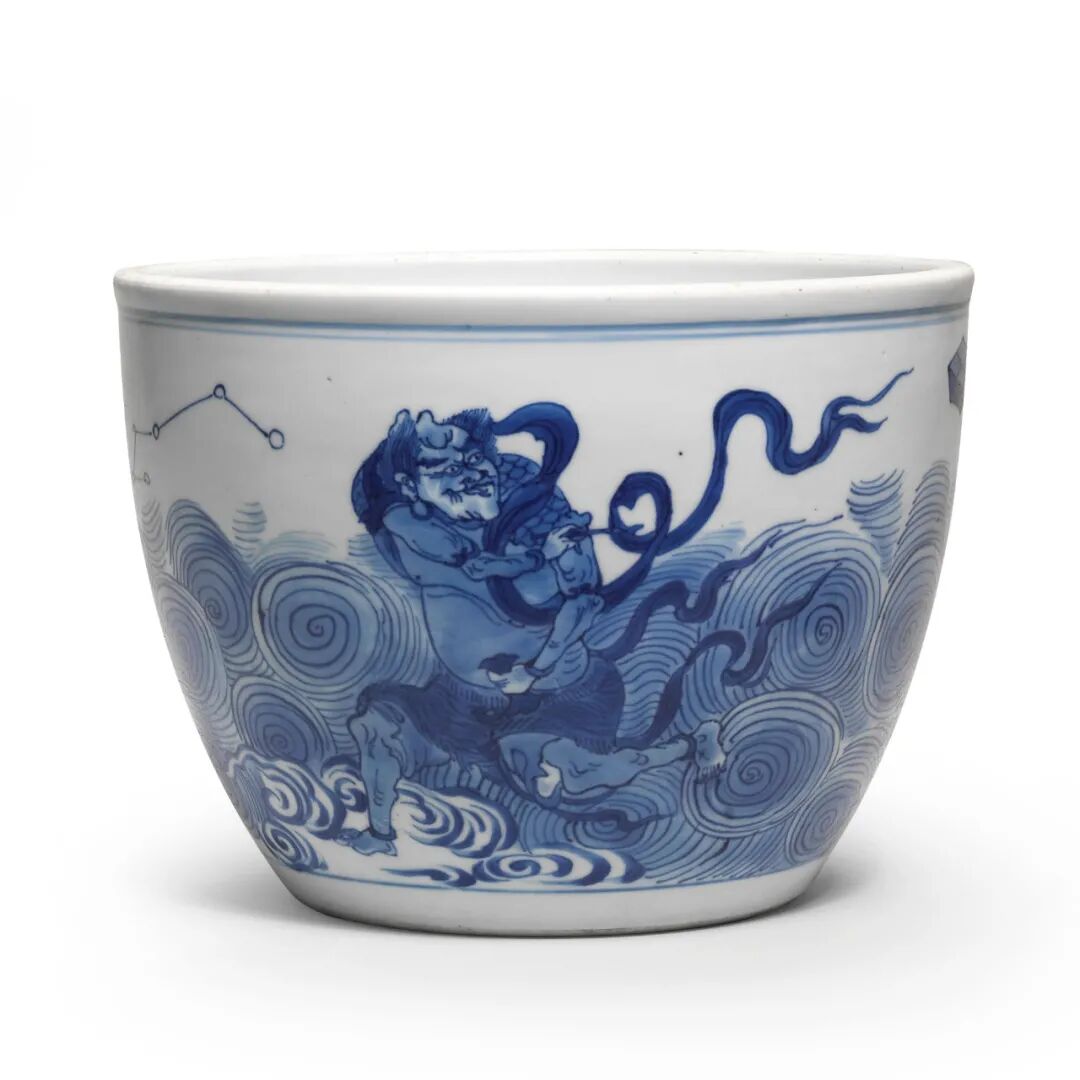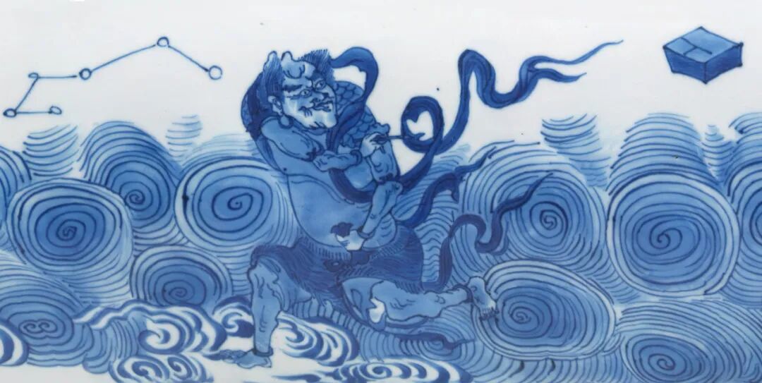 据中国占星学与民间信仰,魁星是北斗七星的第一颗星。或许正因如此,本青花碗在魁星爷以外,只绘了另外的六星挂在苍穹之上。
