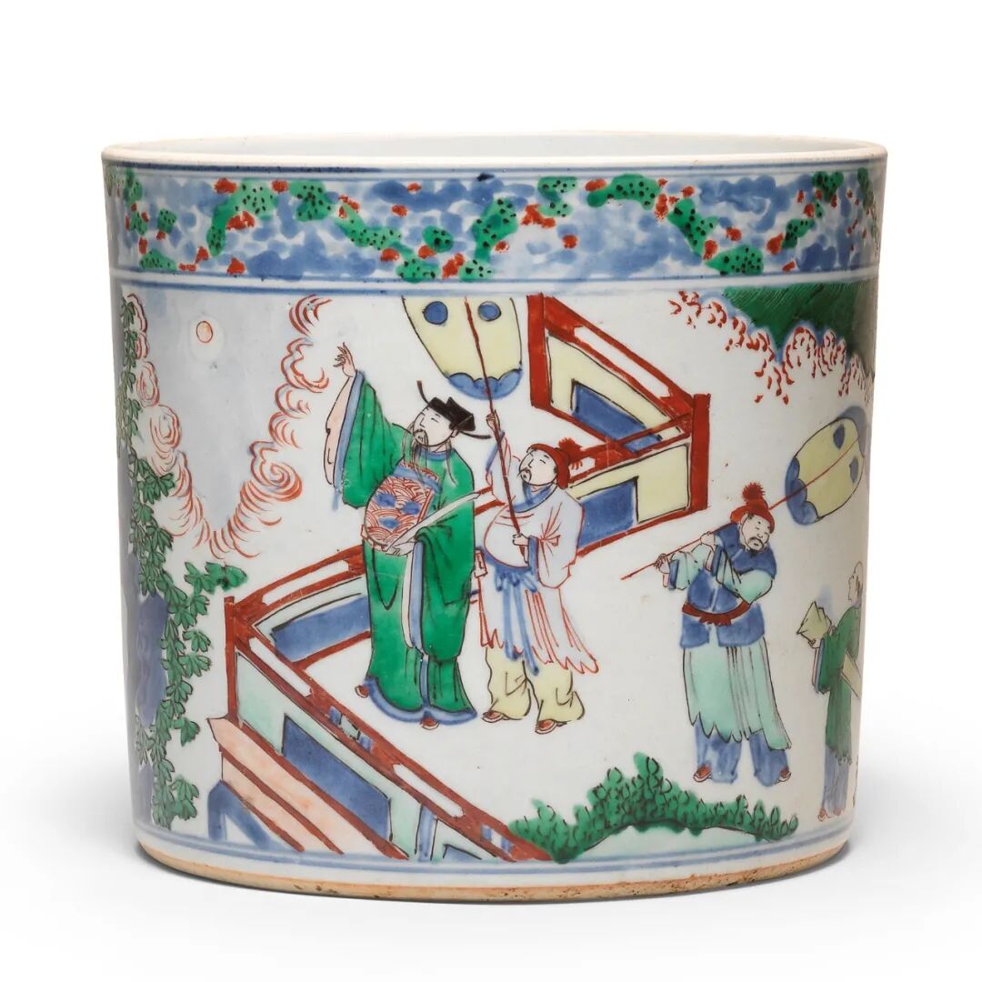 此五彩笔筒正是明末清初的佳作,画中主角头戴高冠,身披官服,手拿朝板,下属仆人持大扇侍候在则,显然是为官之人。他站于高台之上,右手往上指着云端上的红日,取「指日高升」之意。指日高升为明清官场流行的祝贺语,明代程登吉著作《幼学琼林》有言:「代天巡狩,赞称 巡按;指日高升,预贺官僚。」