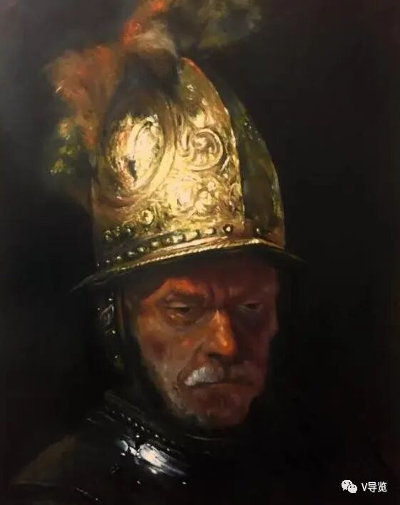 戏剧性的灯光照在金盔上,阴影中两只眼睛炯炯有神。这幅画敢于用黑色,黑得深,才能亮得耀眼。黑的里面还有结构。
