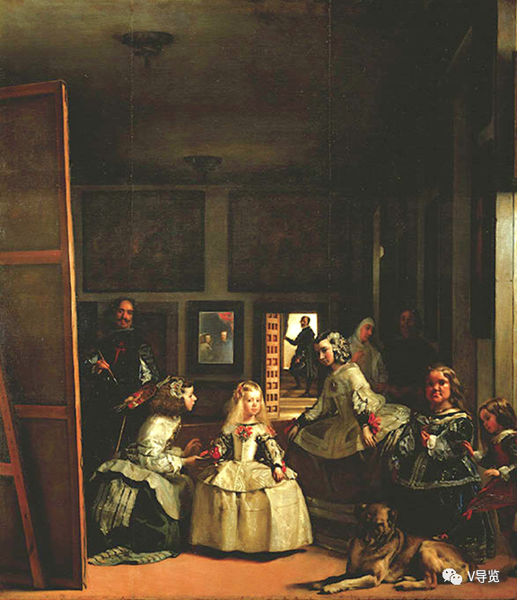 这是一幅宫廷生活照,中间位置的是公主玛格丽特。所有人物都处在一个动态的瞬间。这个是巴洛克时期故事性人物画的特点,就是众多人物被安排在一个协调的瞬间,处于动态的互动中。这一点是巴洛克时期人物画超越文艺复兴时期绘画的地方。