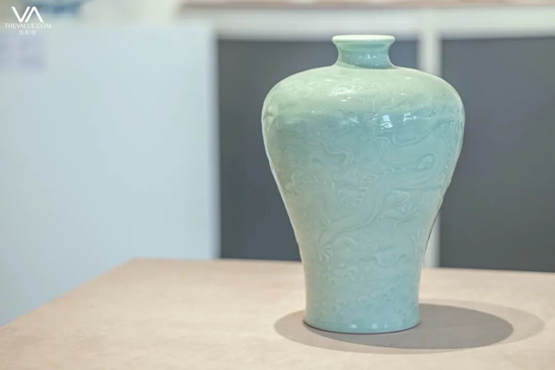 首先是非常夺目的粉青釉梅瓶,瓶身饰以三尾五爪龙,傲翔于祥云海水之间,象征乾隆帝对国家风调雨顺的期许,圈足内篆书「大清乾隆年制」六字款。