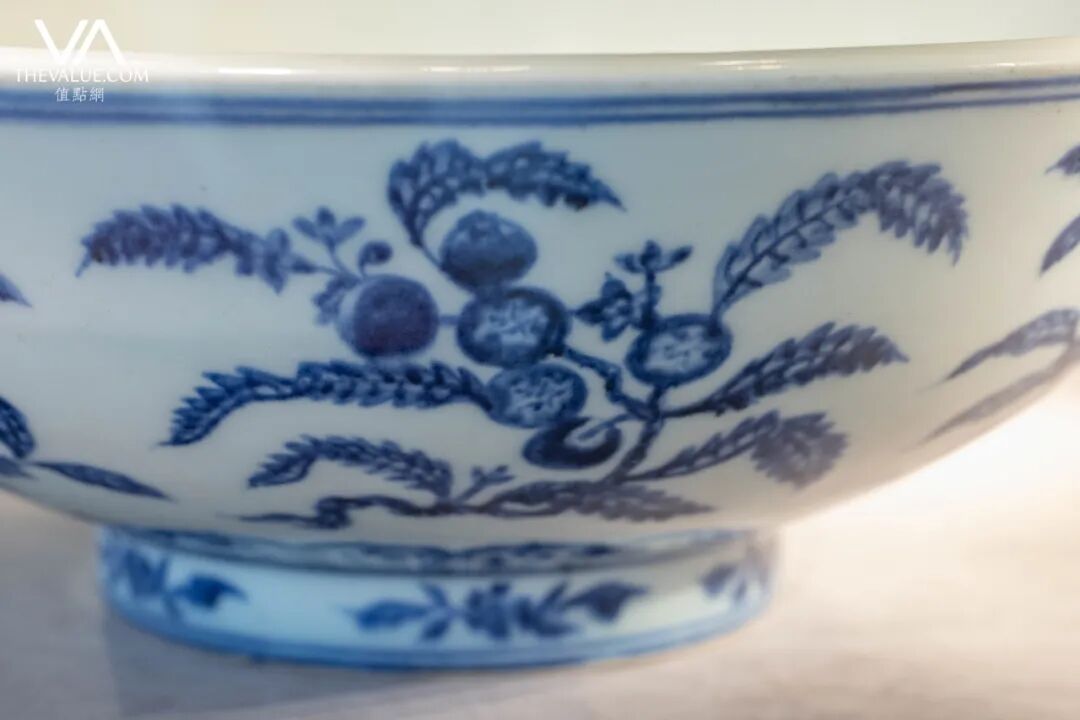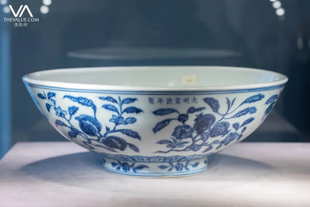 接着是大名鼎鼎的宣德青花瓷。碗身折枝花果纹的设计颇为罕见,青花发色绚丽鲜艳,如同在宣纸作画留下的笔触墨痕,极富风韵,口沿书「大明宣德年制」款。
