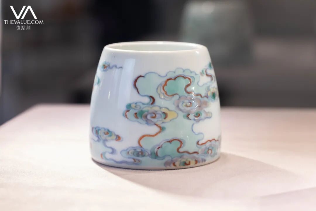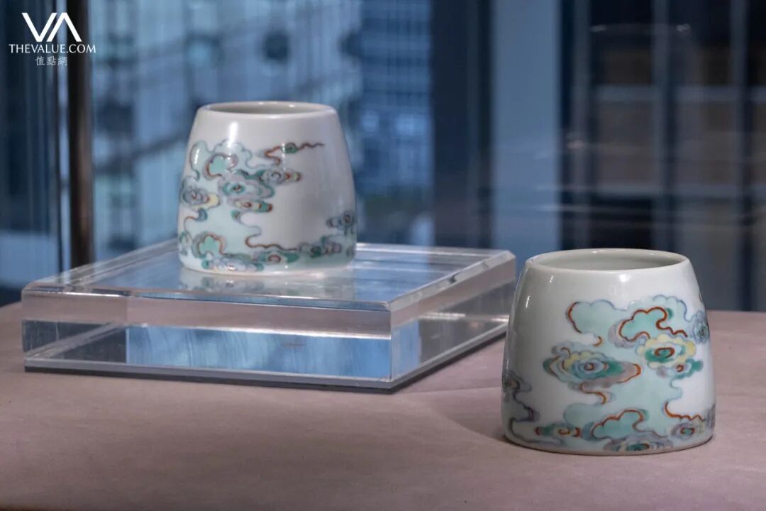 回到有清一代的官窑瓷器,我们有一对马蹄式水丞,底书「大清雍正年制」双圈六字款,以斗彩在白地上饰祥云纹,尽显雍正帝的脱俗品味。