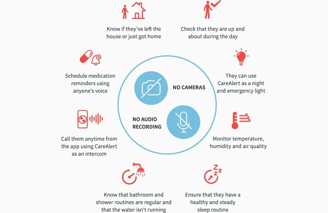 CareAlert作为一款关怀性夜灯可以帮助你照顾家里的老年人,同时也不需要老人具备专业的能力。CareAlert通过传感器来测量实时温度、湿度、空气质量、光线、噪声等环境因素,也能追踪老人的运动轨迹,保证子女通过手机终端能及时了解老人的健康状况。