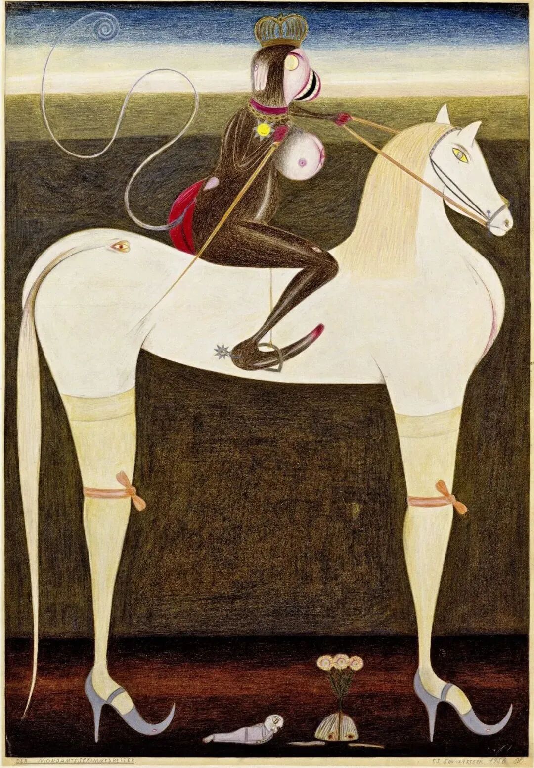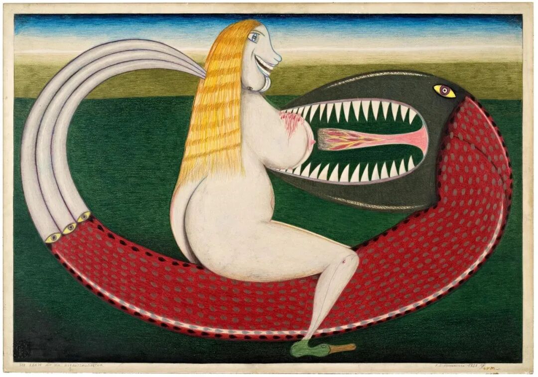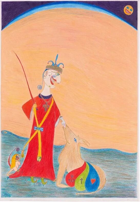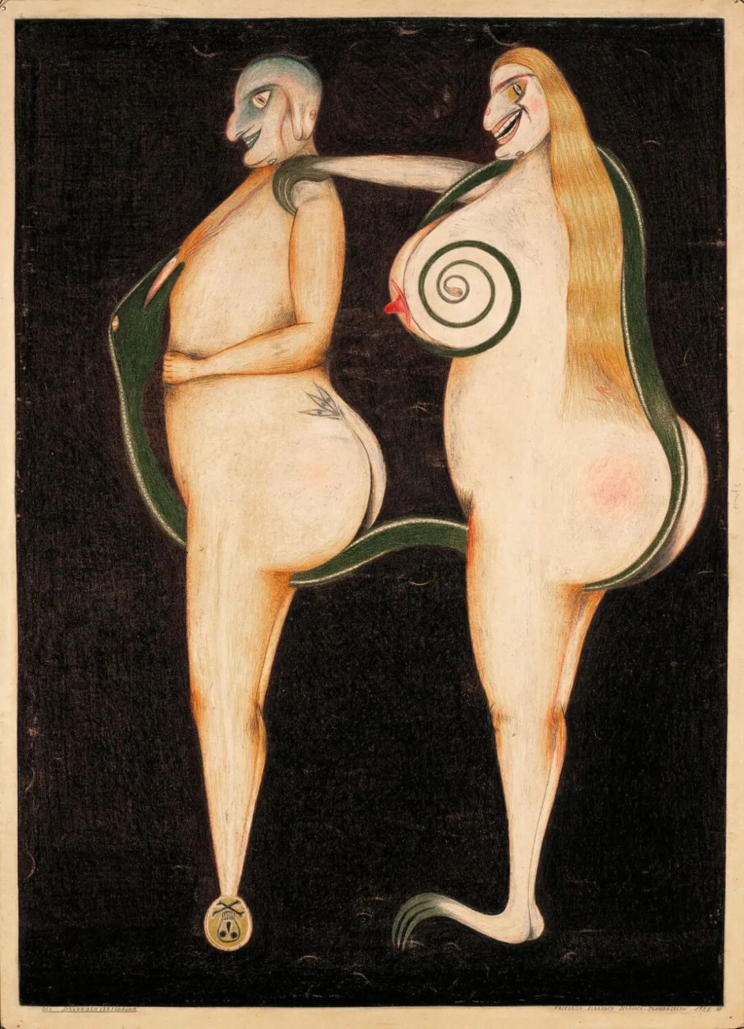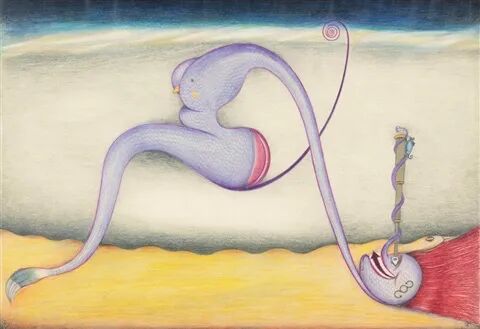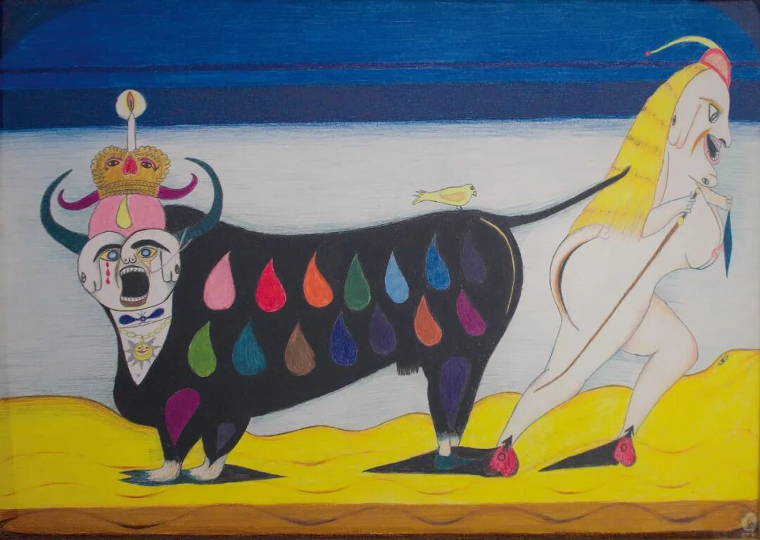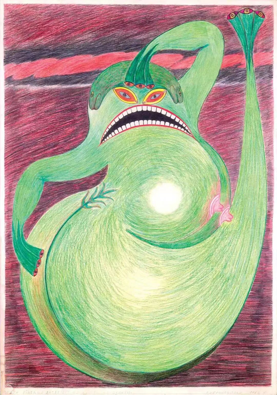 他50多岁时开始画画,用彩色铅笔创作寓言怪诞的作品,上面放满了个人肖像画,圆润的乳房和同样圆润的臀部、蛇、马、微笑的小太阳,天使的翅膀、自由浮动的眼睛、彩虹和螺旋。
