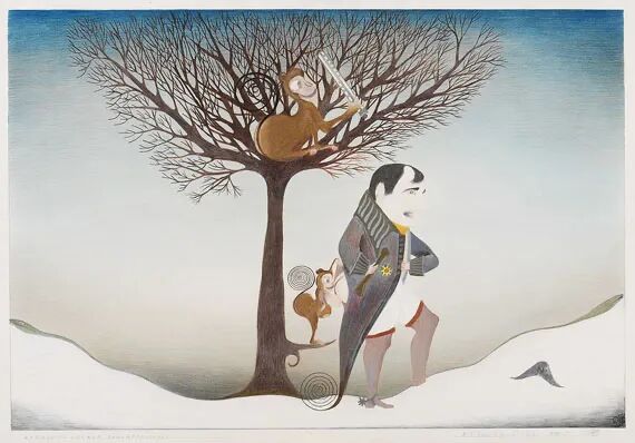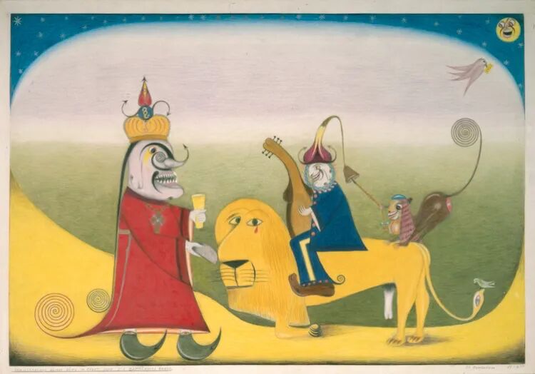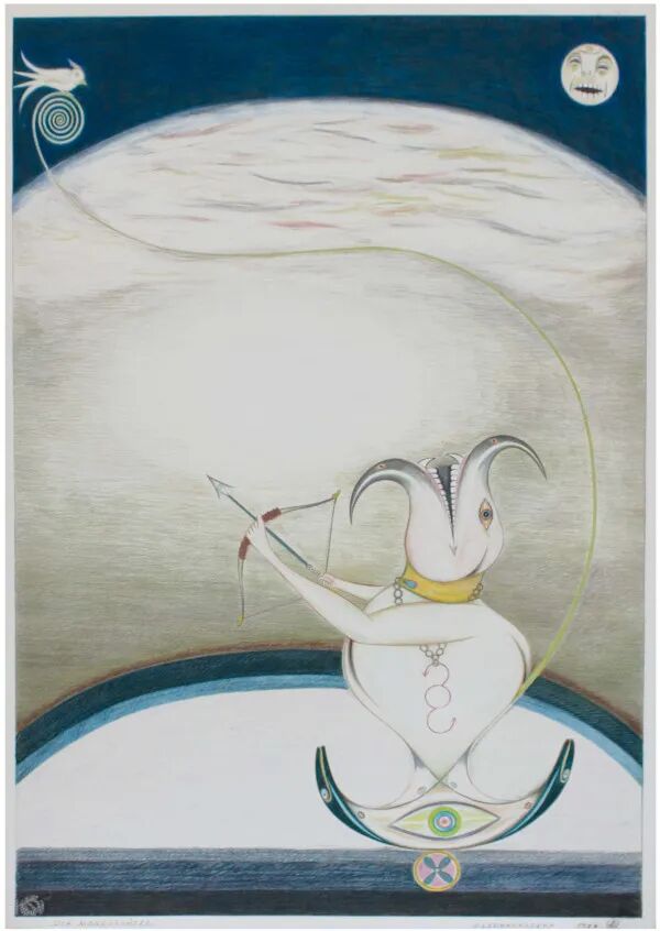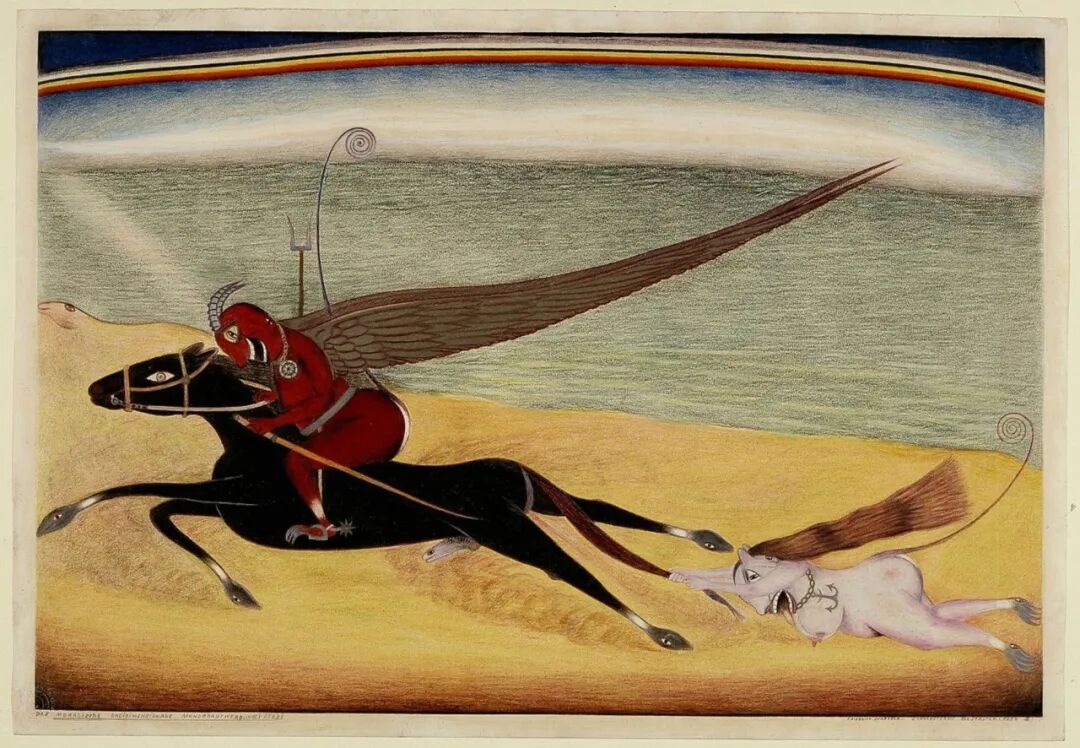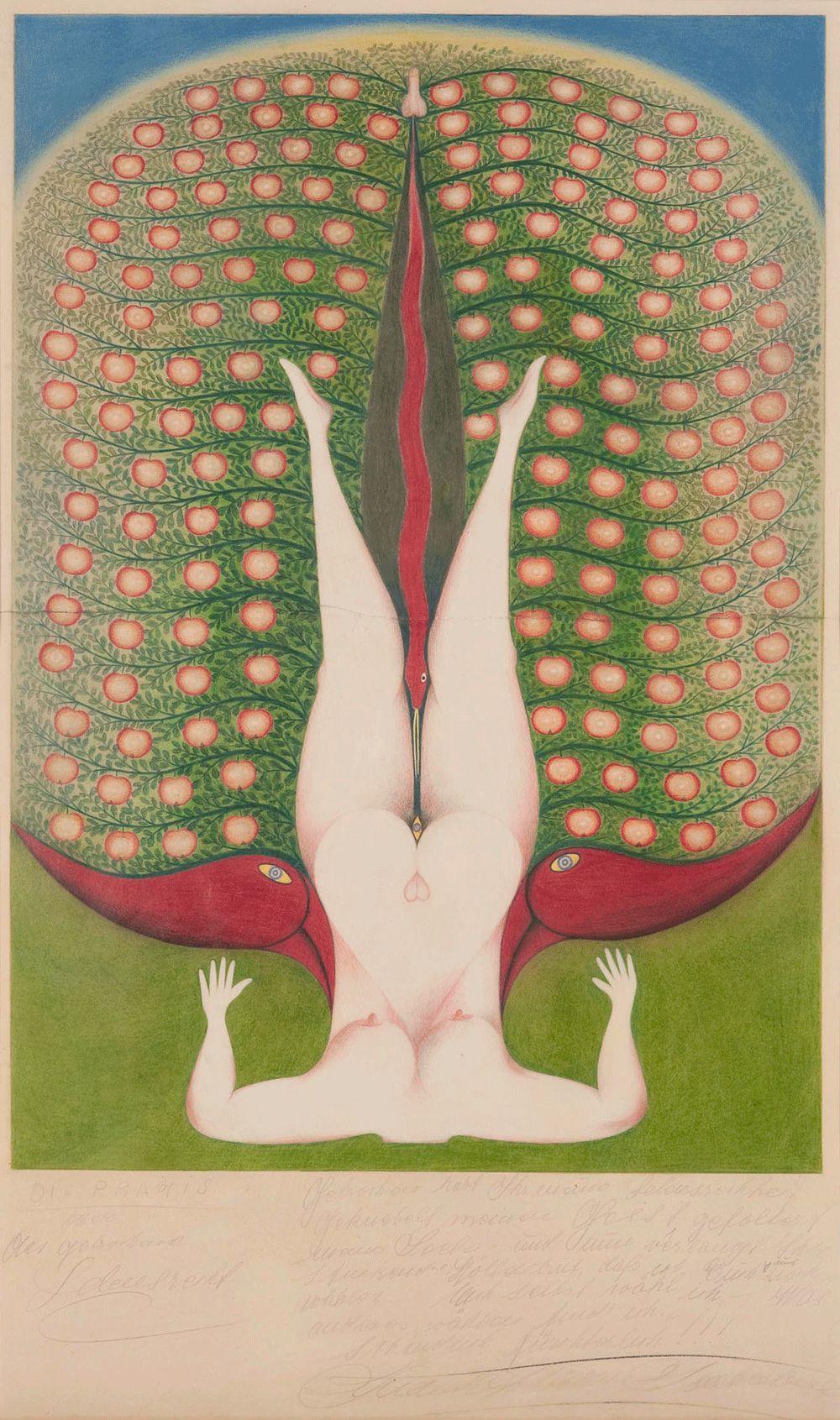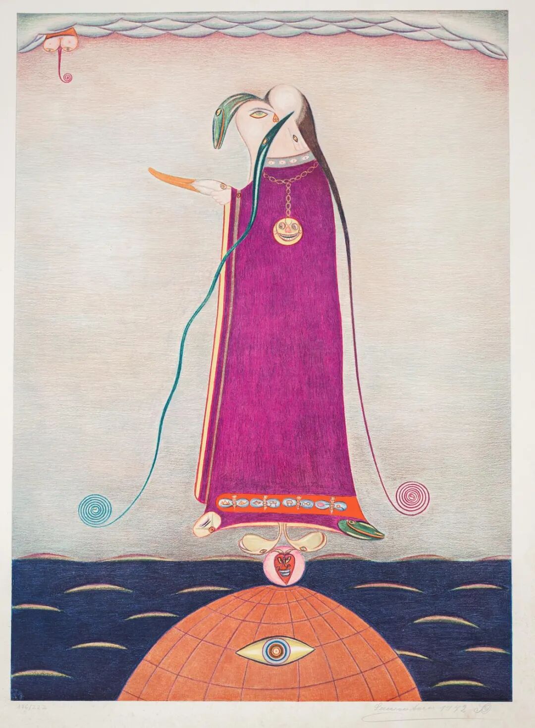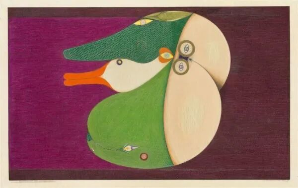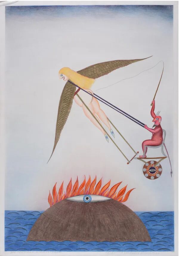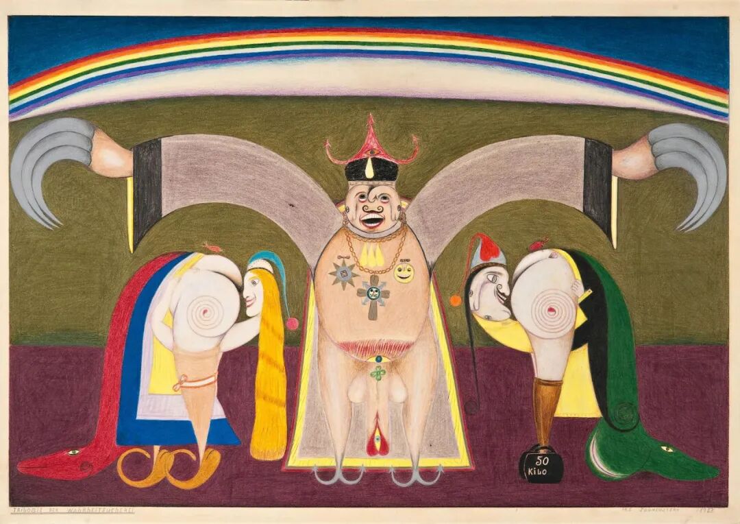 他50多岁时开始画画,用彩色铅笔创作寓言怪诞的作品,上面放满了个人肖像画,圆润的乳房和同样圆润的臀部、蛇、马、微笑的小太阳,天使的翅膀、自由浮动的眼睛、彩虹和螺旋。