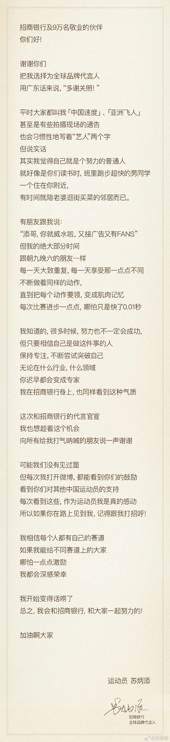 除了告白TVC外,招行还以一封“致苏炳添先生的一封信”,感谢苏神带来的中国骄傲。
