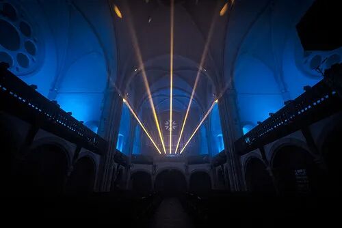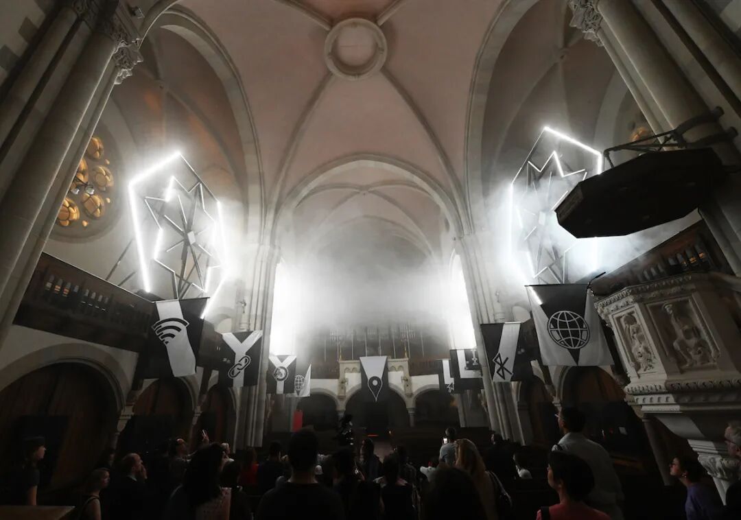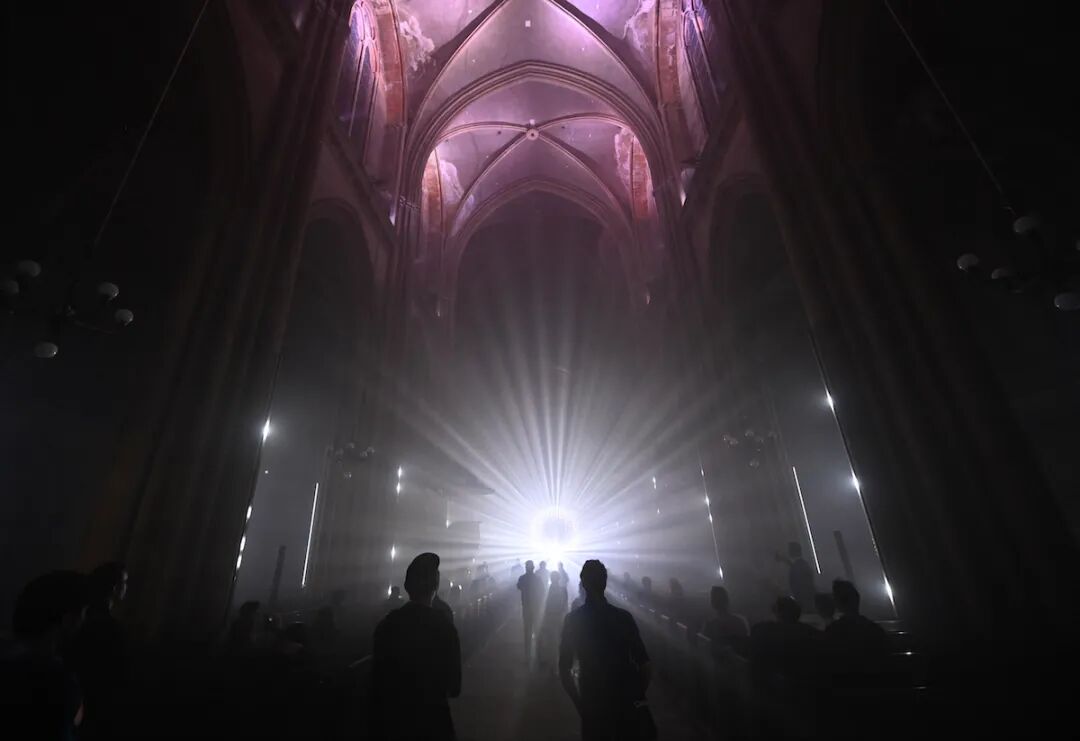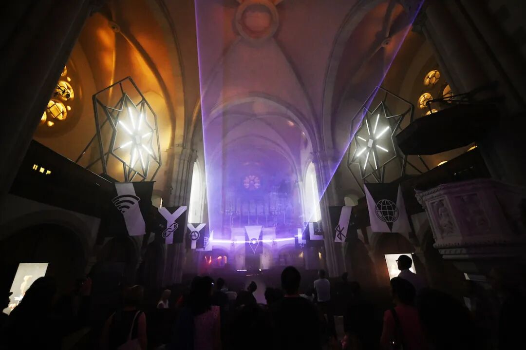 在这里你不仅可以感受到恩典之光的肃穆,也能体验更多魔幻现实的宗教艺术作品。例如 Romain Tardy 所创作的教堂内声光作品”万岁纪念”就用纷杂绚烂的光线庆祝了数字时代的来临以及旧有生活方式的终结。