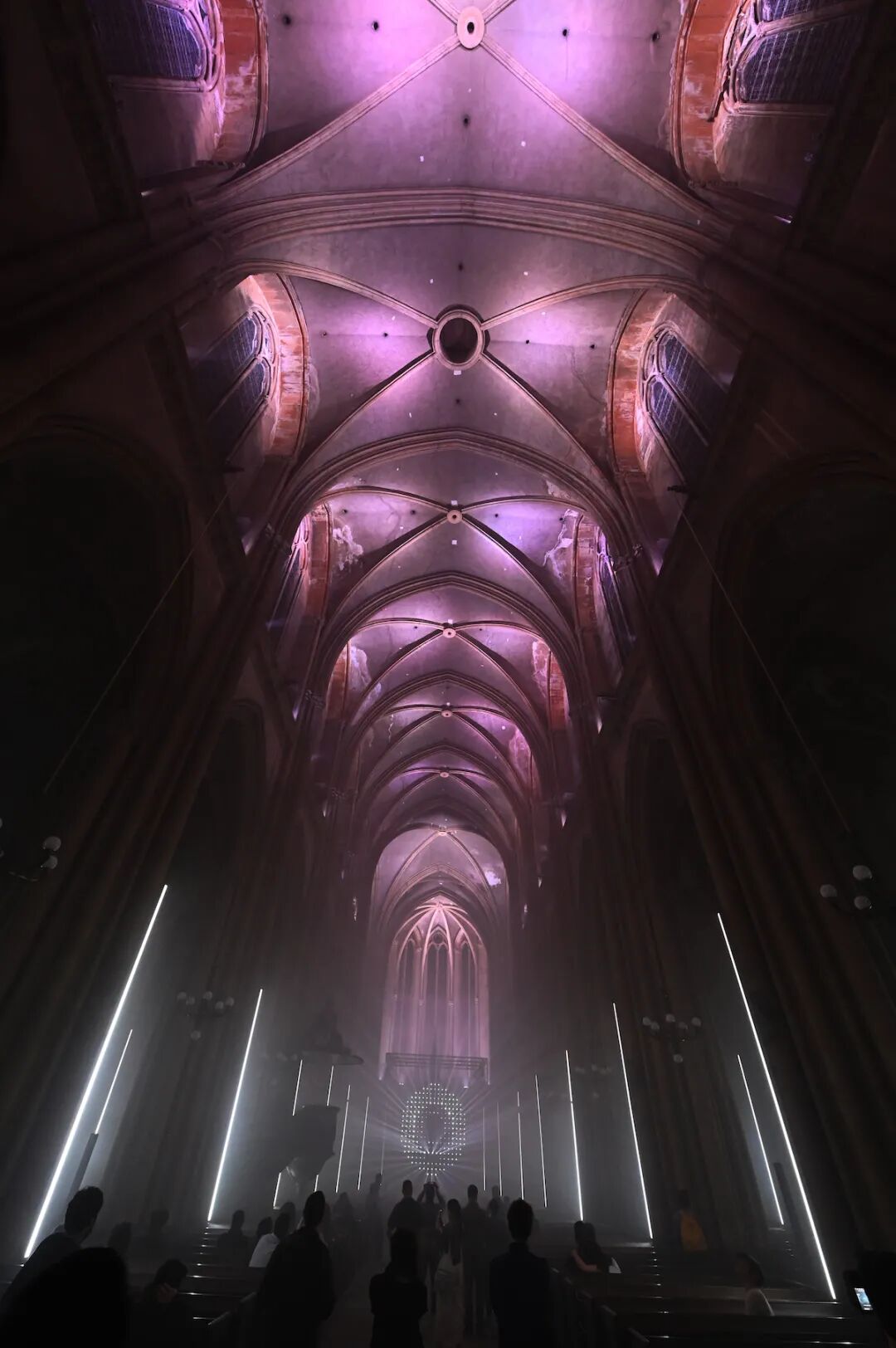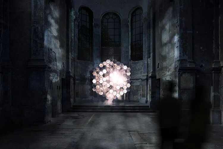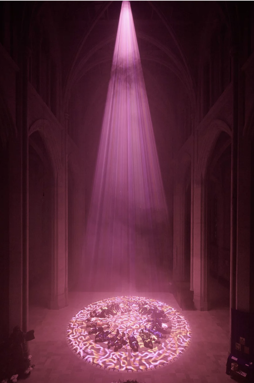 光点亮了教堂,然而石制的修女像、围成圈的信徒,却又为神圣的教堂蒙上了神秘的面纱。装置投下清晰的结界,划分了光明与黑暗,吸引着所有灵魂大步向前踏去