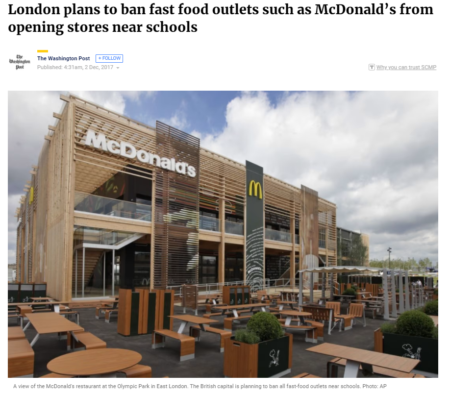 这项政策——比洛杉矶的政策更全面、更针对儿童,后者只禁止连锁店在南洛杉矶的一个街区开业。而伦敦的这项禁令应该有助于阻止儿童肥胖这一“定时炸弹”。该市近 40% 的孩子在完成小学学业时超重,肥胖比例在英国各市里最高。因此,阻止外卖店开在学校旁边也有着非常重要的意义。