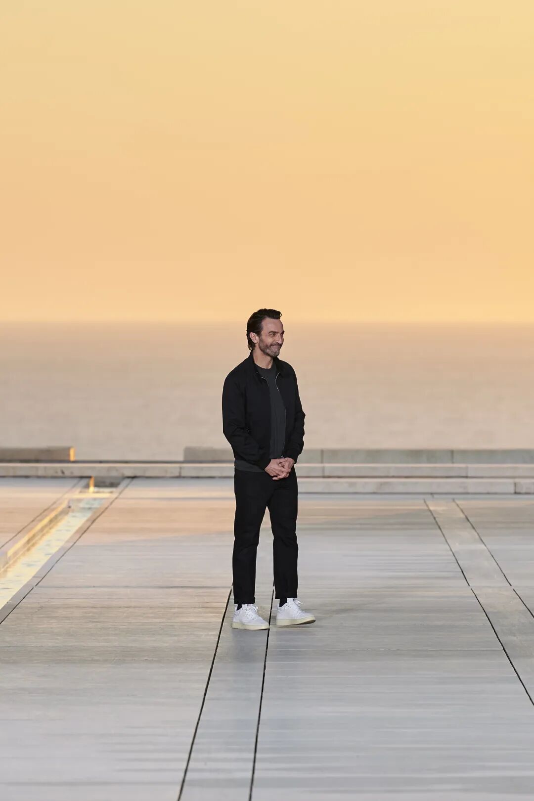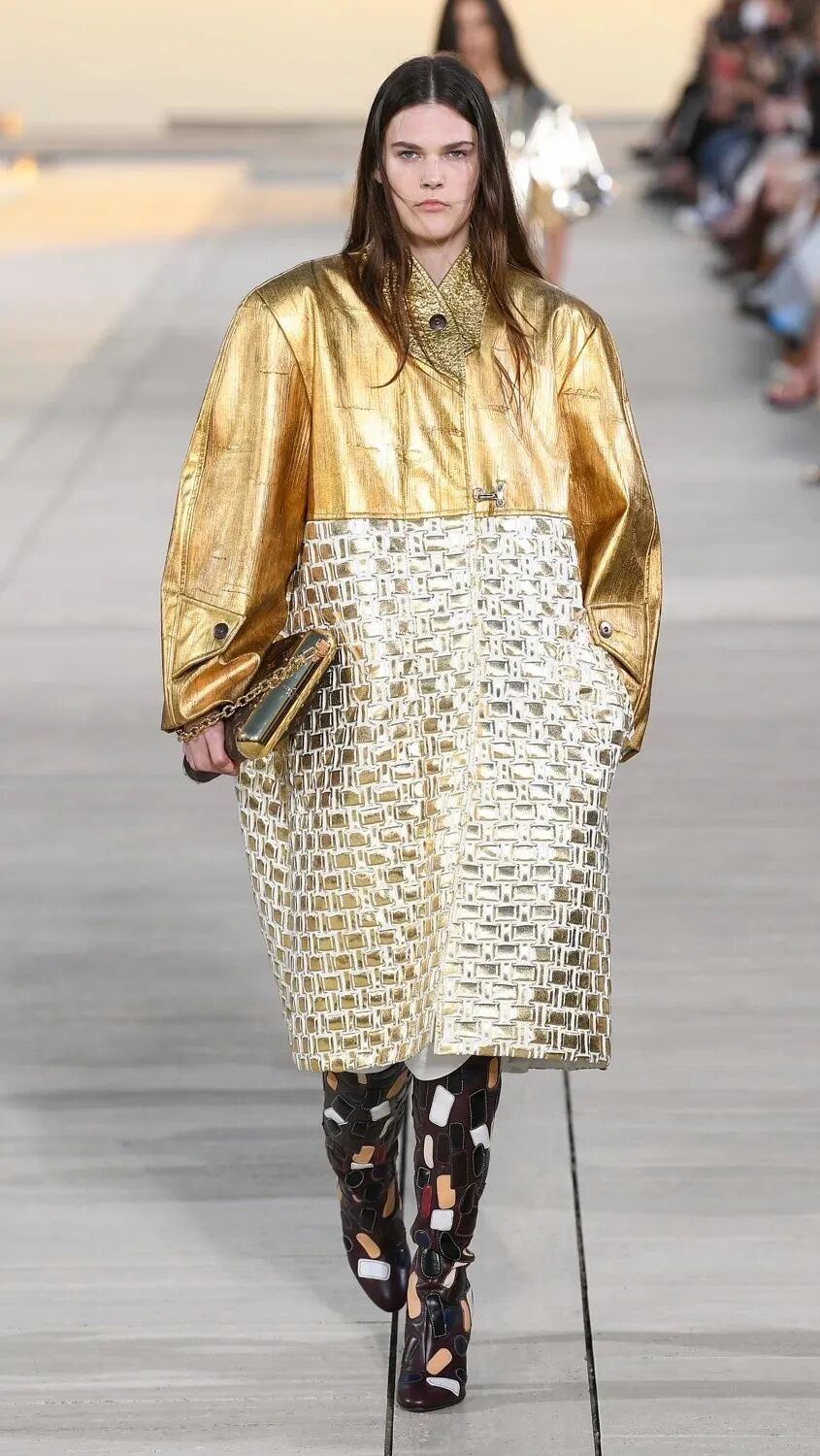 Louis Vuitton 在官方新闻稿中介绍:“太阳,是路易威登2023早春系列时装秀场的尊贵宾客。日出日落带来温度变幻,衣橱风格因此不断演变。细沙与悬崖,因温度变化而平添一抹游牧风格,演绎流畅飘逸。西海岸的独特光线掩映于华服之间,令其摇曳生姿。亚麻布、提花、丝绸、皮革、粗花呢……宛若蒙上一层金属色调,在阳光下熠熠生辉。摇曳多姿的衣服轮廓与漫天夕阳呢喃细语。”