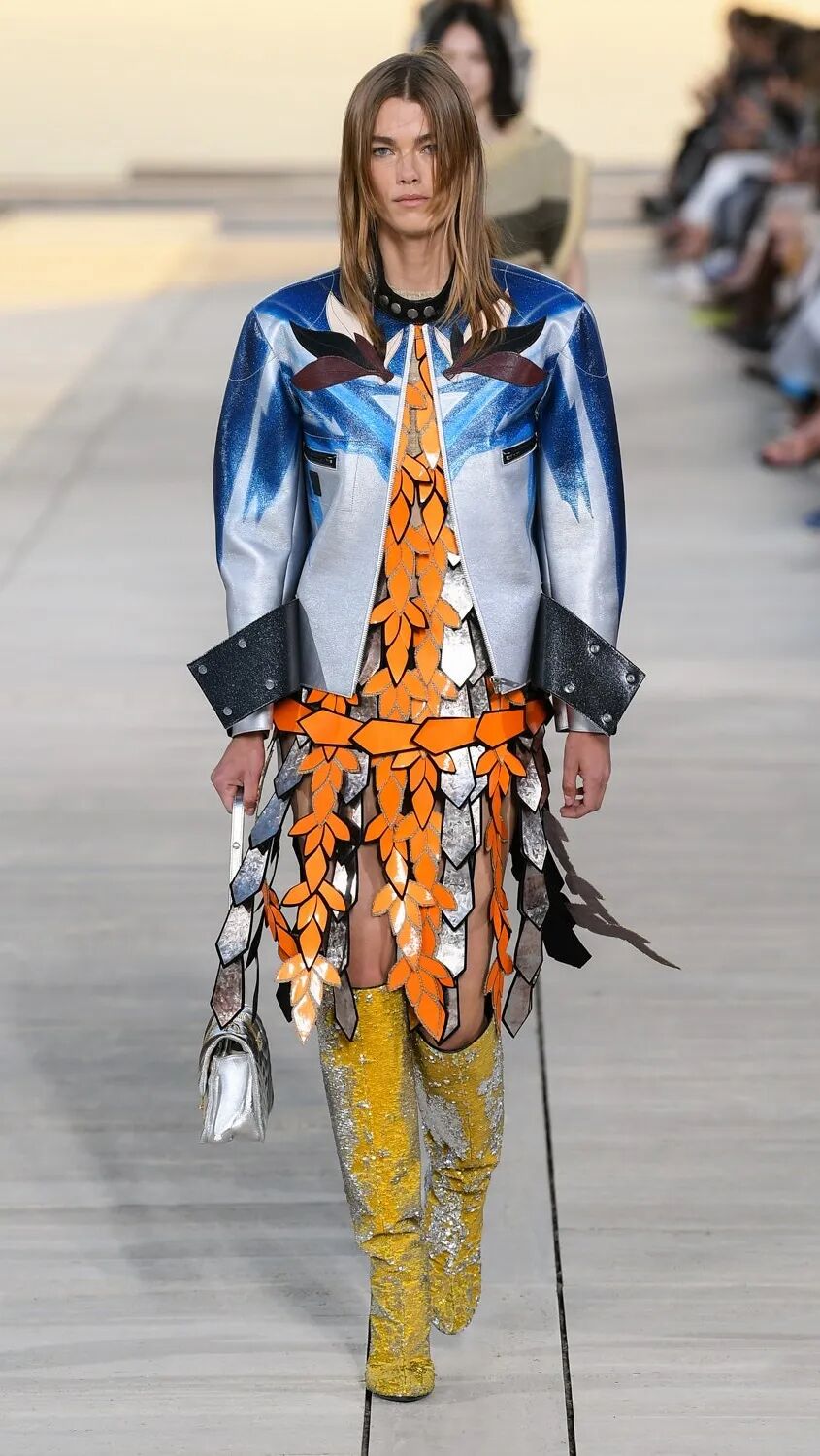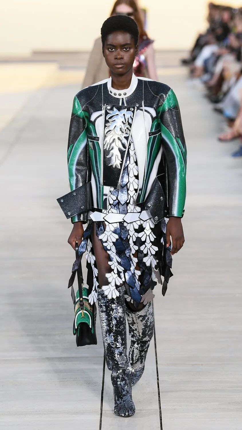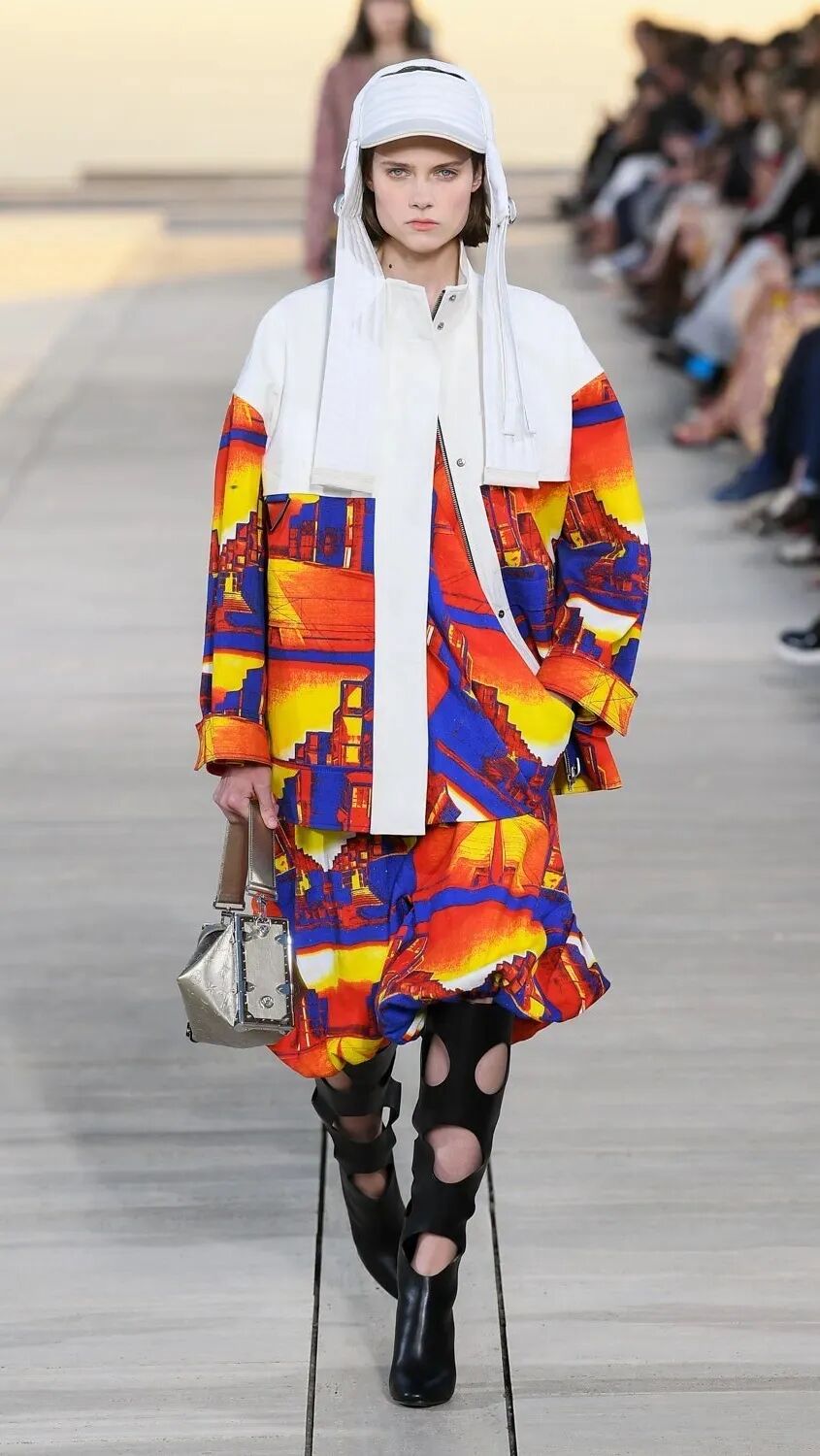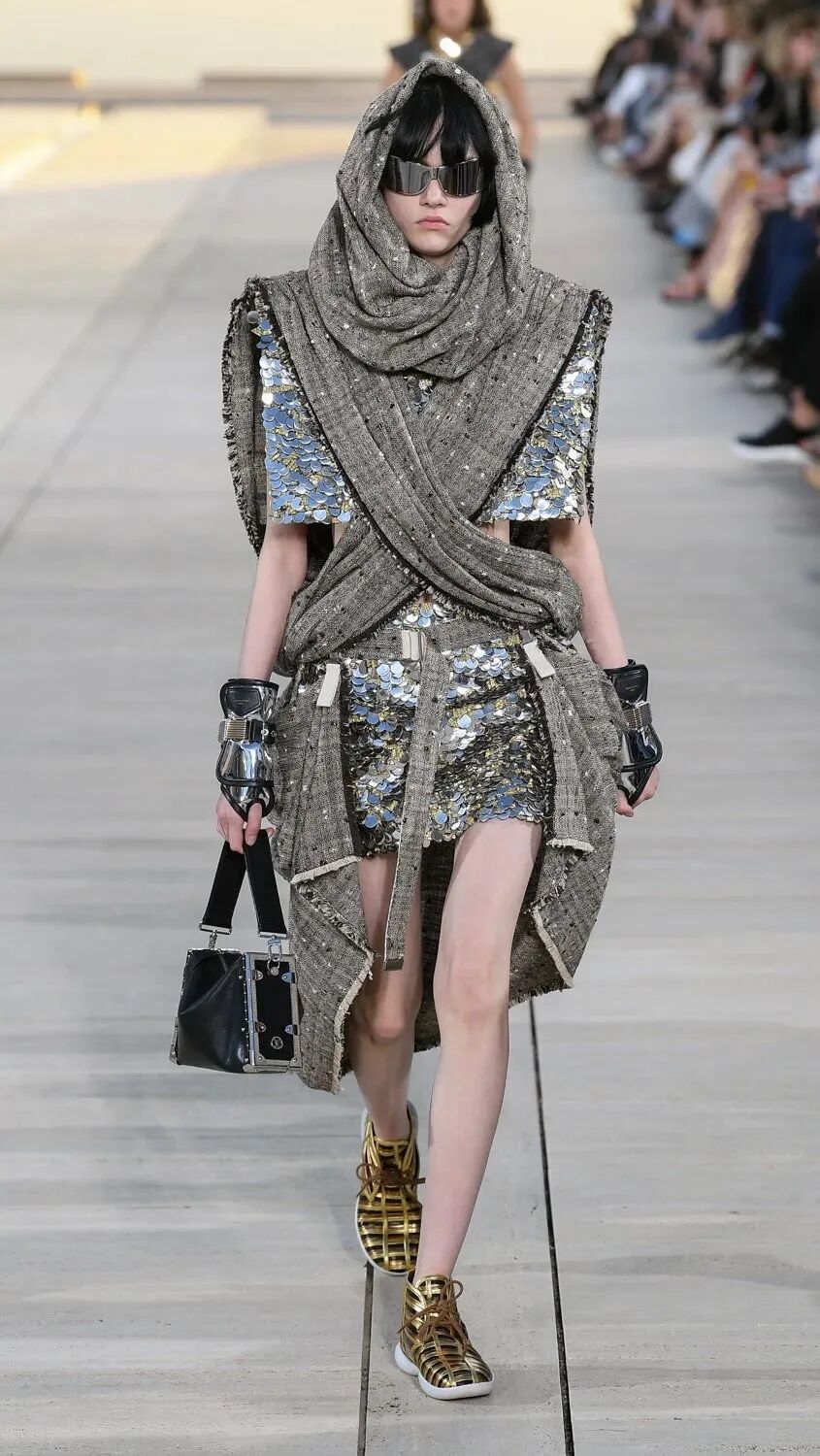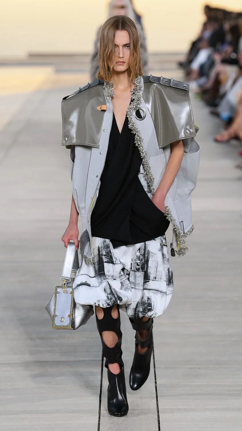 Nicolas Ghesquière 选择在傍晚时分开始此次大秀,将城市语言与建筑美学融合,充满未来主义的剪裁之上,透露着过往宫廷中华丽的美感。