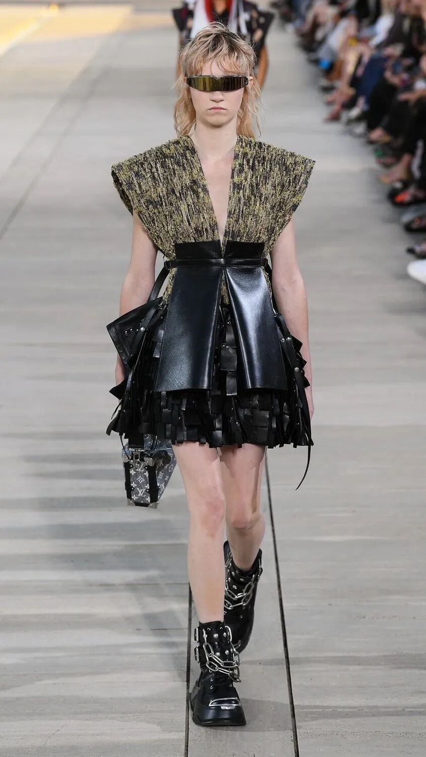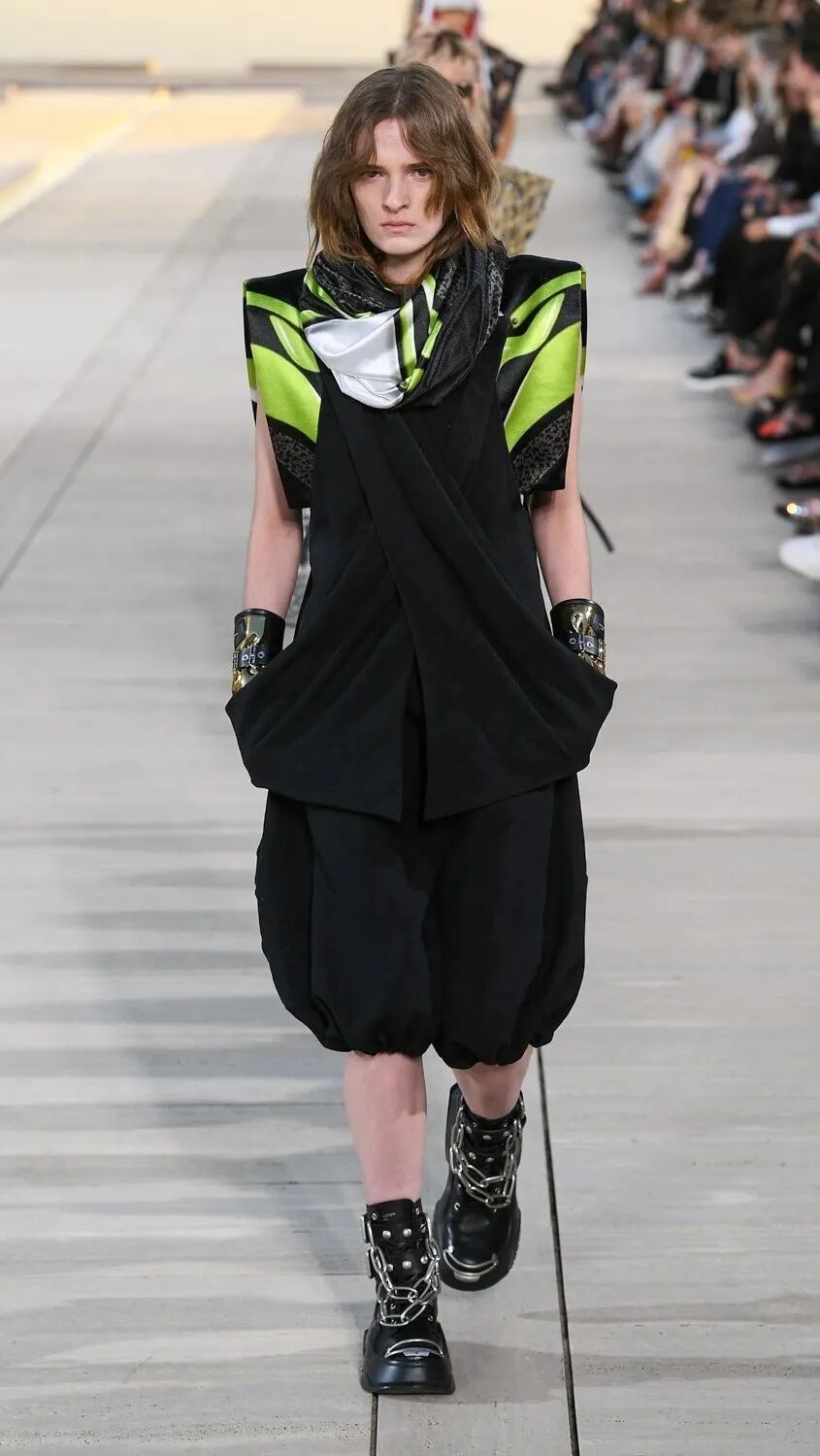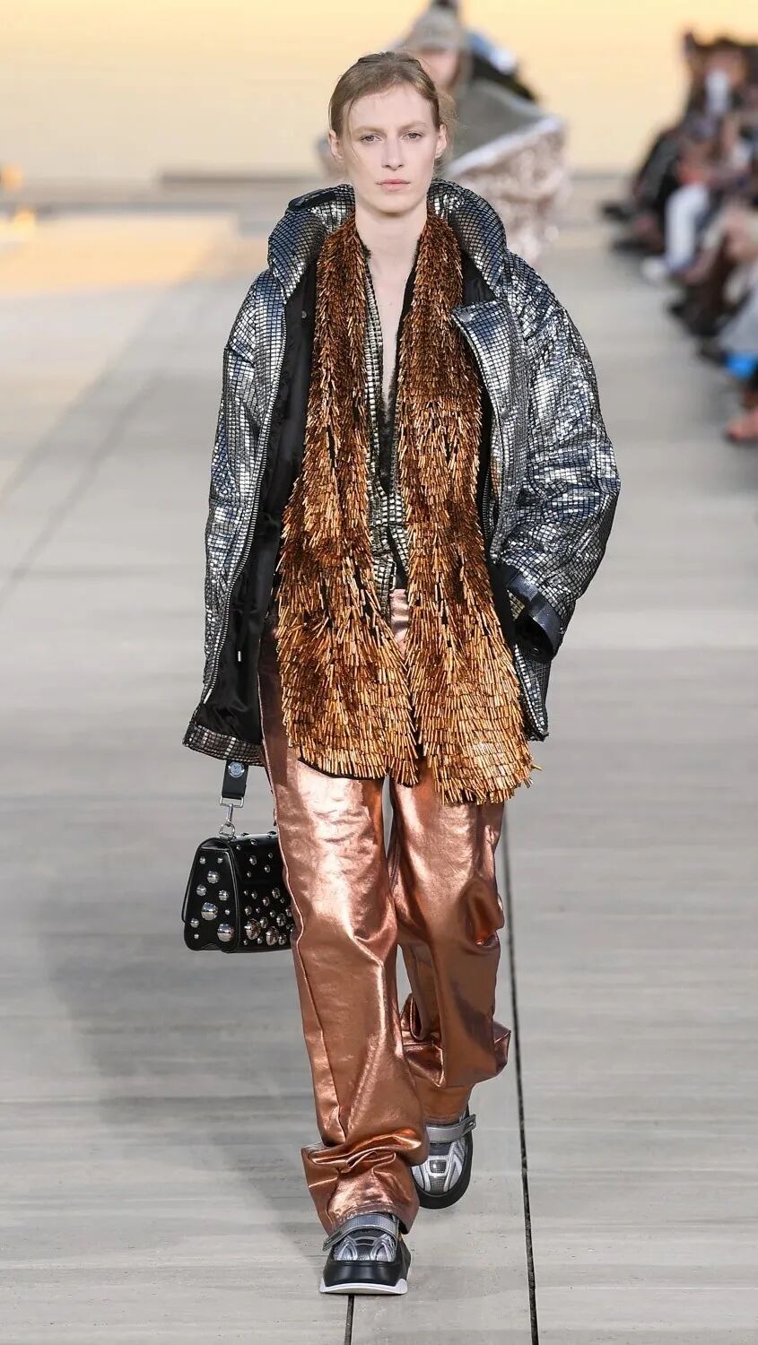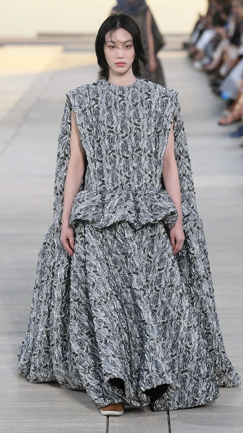 Nicolas Ghesquière 选择在傍晚时分开始此次大秀,将城市语言与建筑美学融合,充满未来主义的剪裁之上,透露着过往宫廷中华丽的美感。