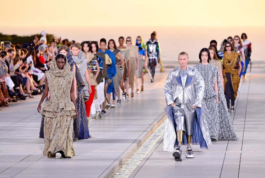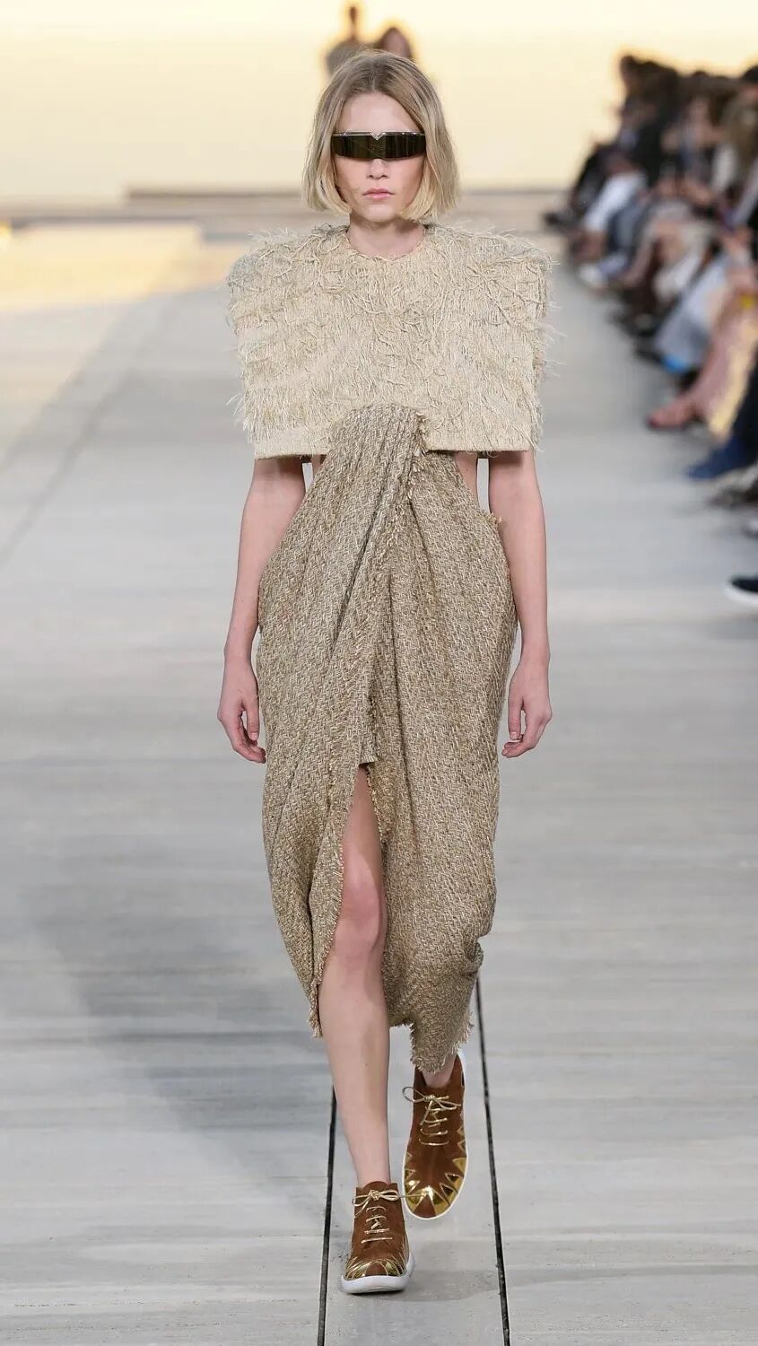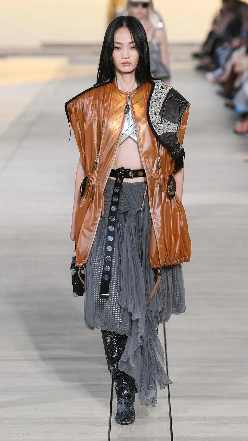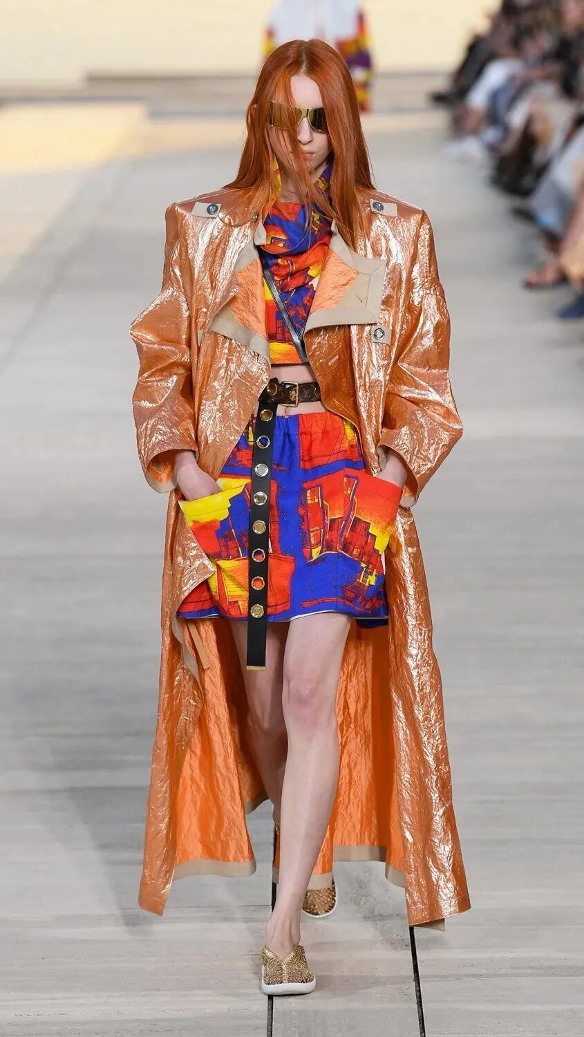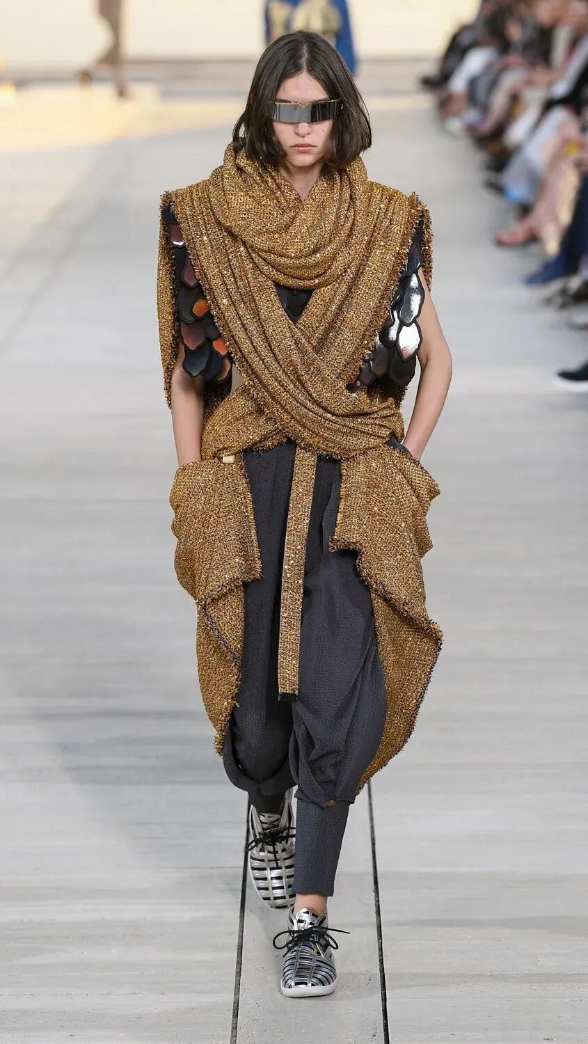 Nicolas Ghesquière 选择在傍晚时分开始此次大秀,将城市语言与建筑美学融合,充满未来主义的剪裁之上,透露着过往宫廷中华丽的美感。