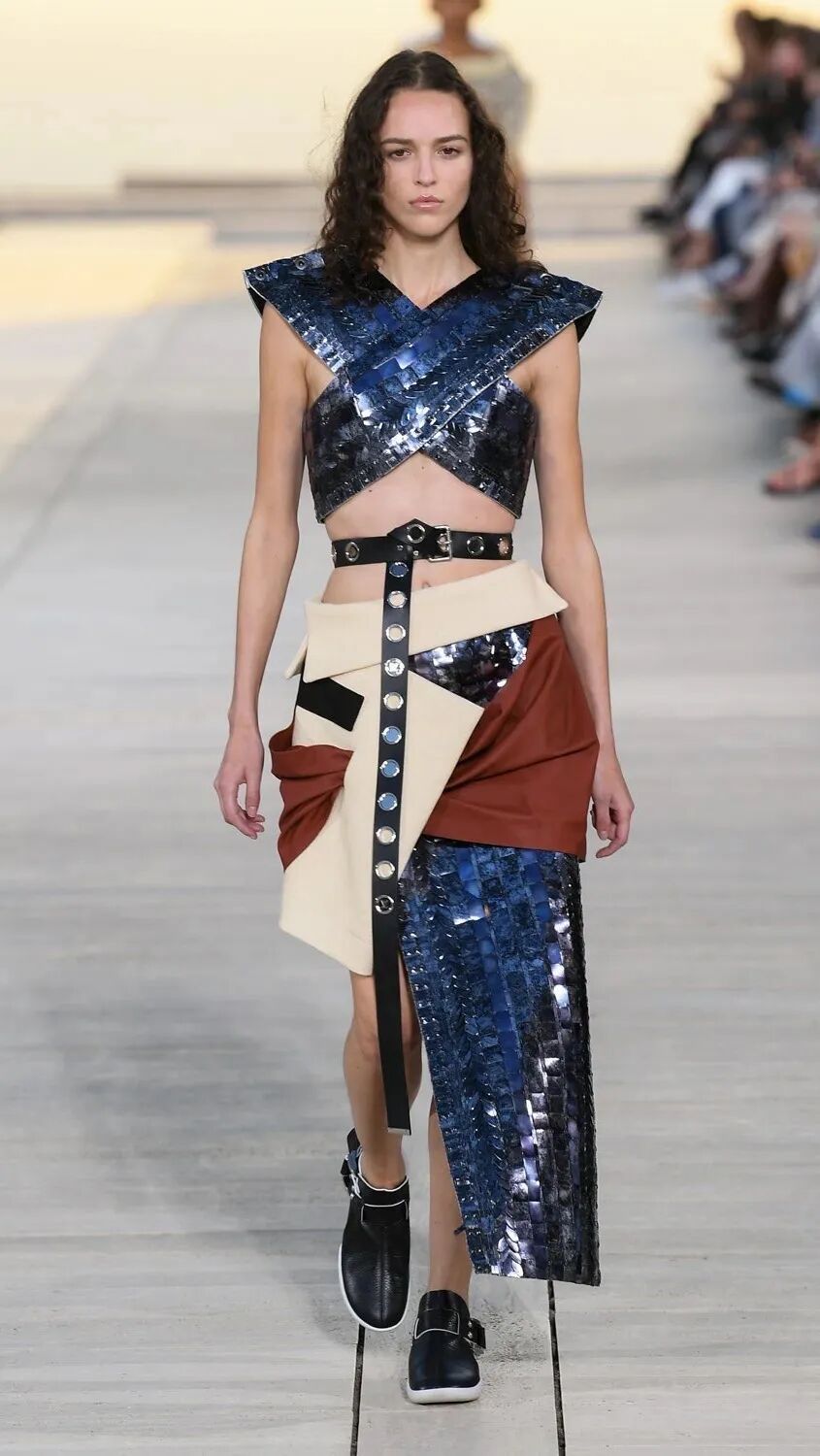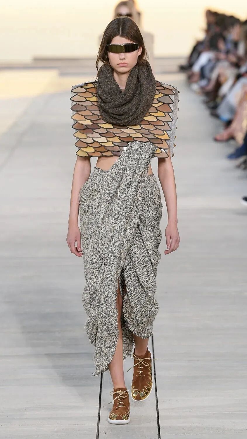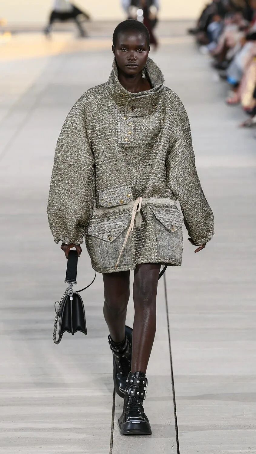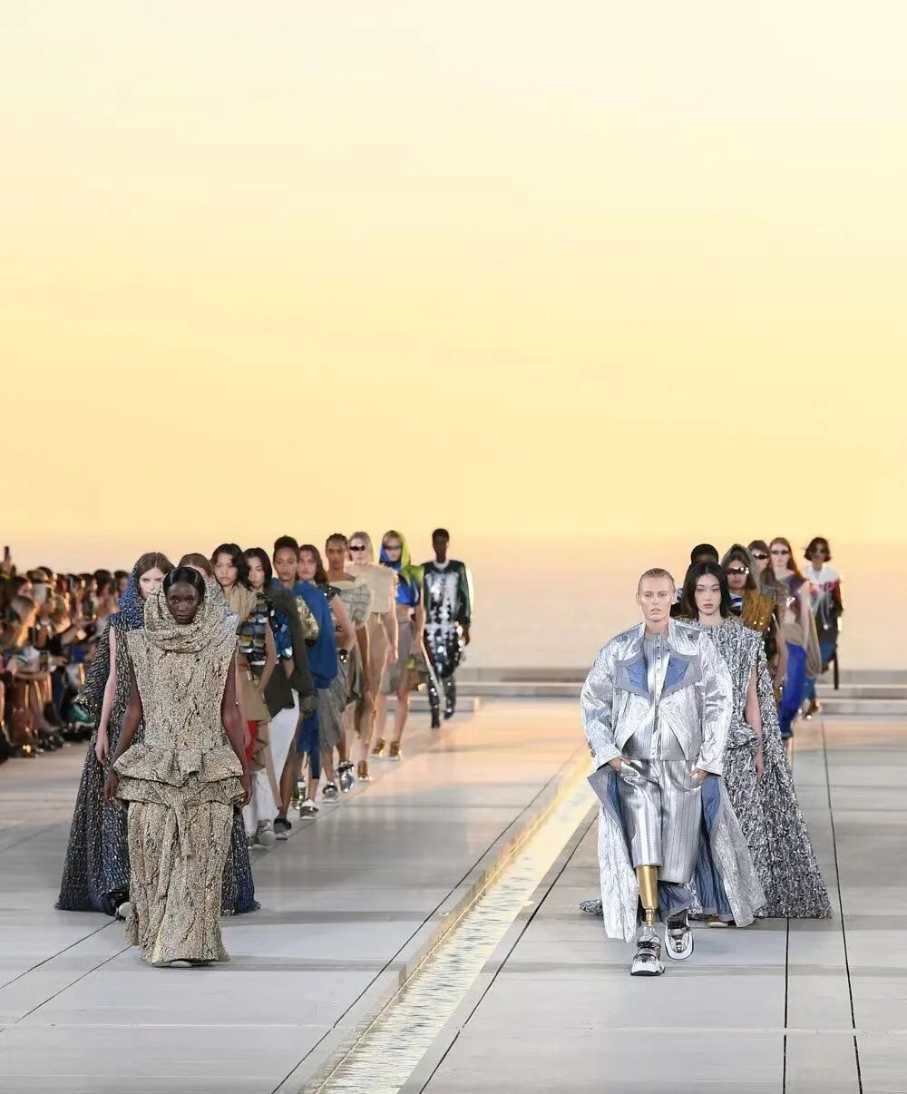 Nicolas Ghesquière 选择在傍晚时分开始此次大秀,将城市语言与建筑美学融合,充满未来主义的剪裁之上,透露着过往宫廷中华丽的美感。