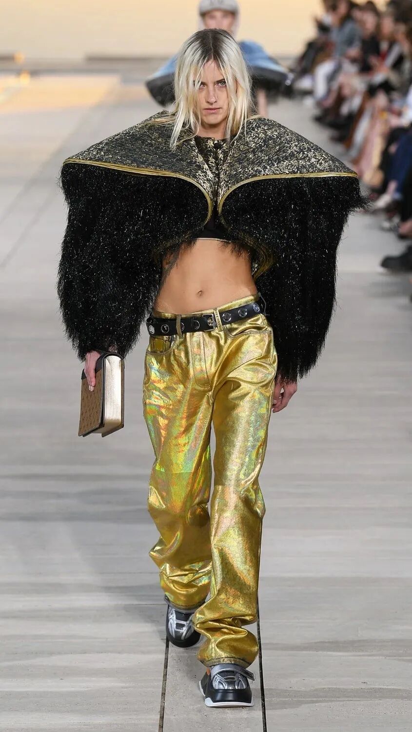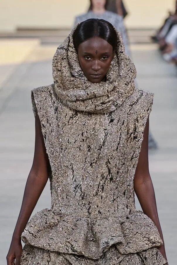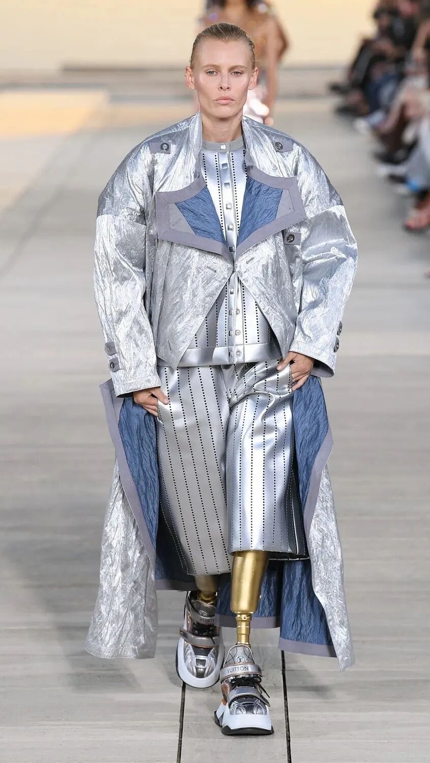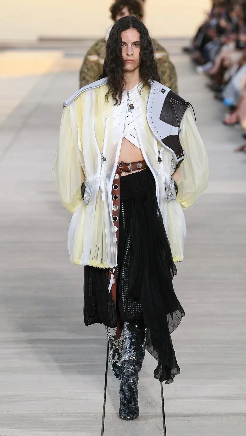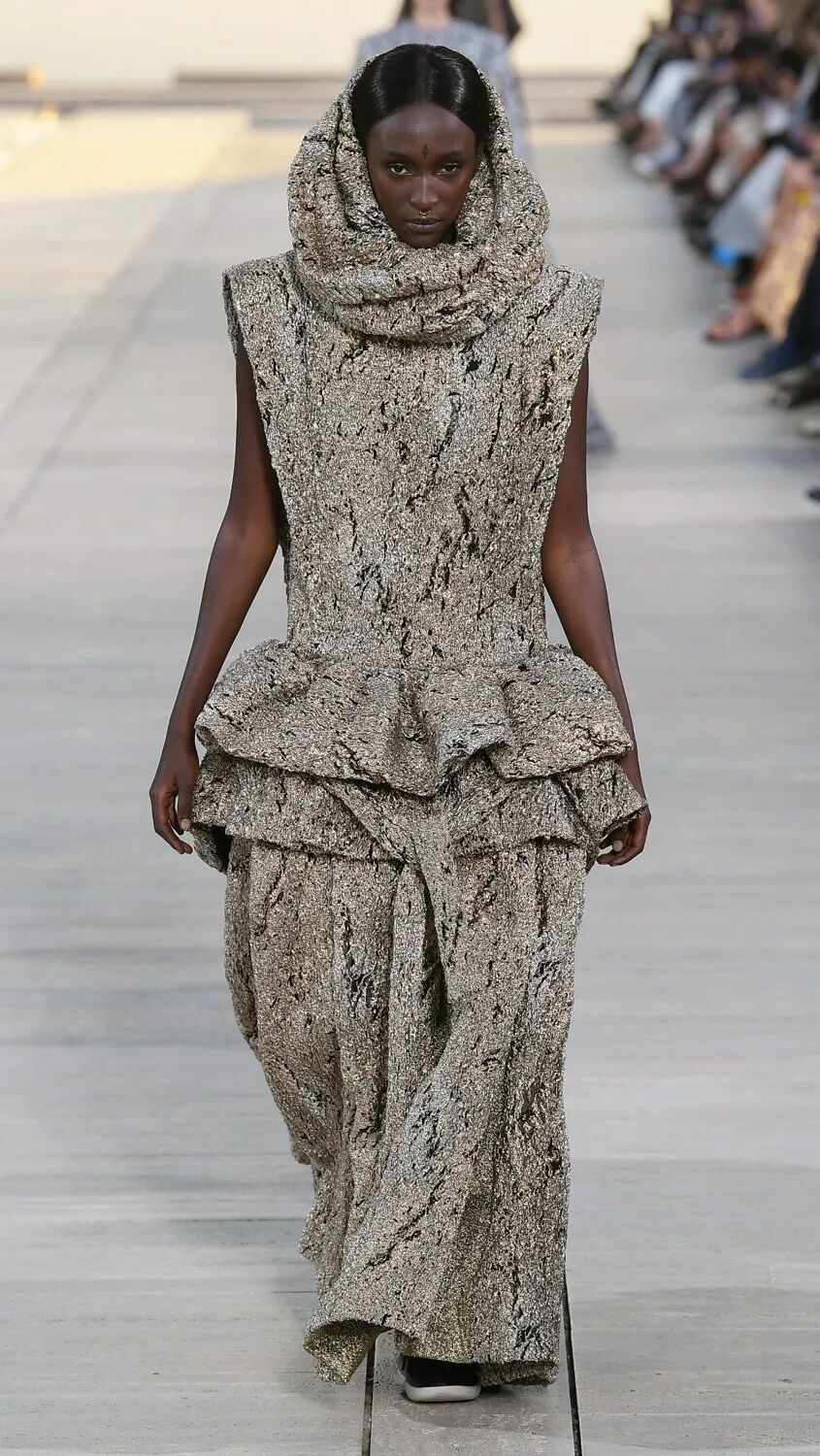 Nicolas Ghesquière 选择在傍晚时分开始此次大秀,将城市语言与建筑美学融合,充满未来主义的剪裁之上,透露着过往宫廷中华丽的美感。