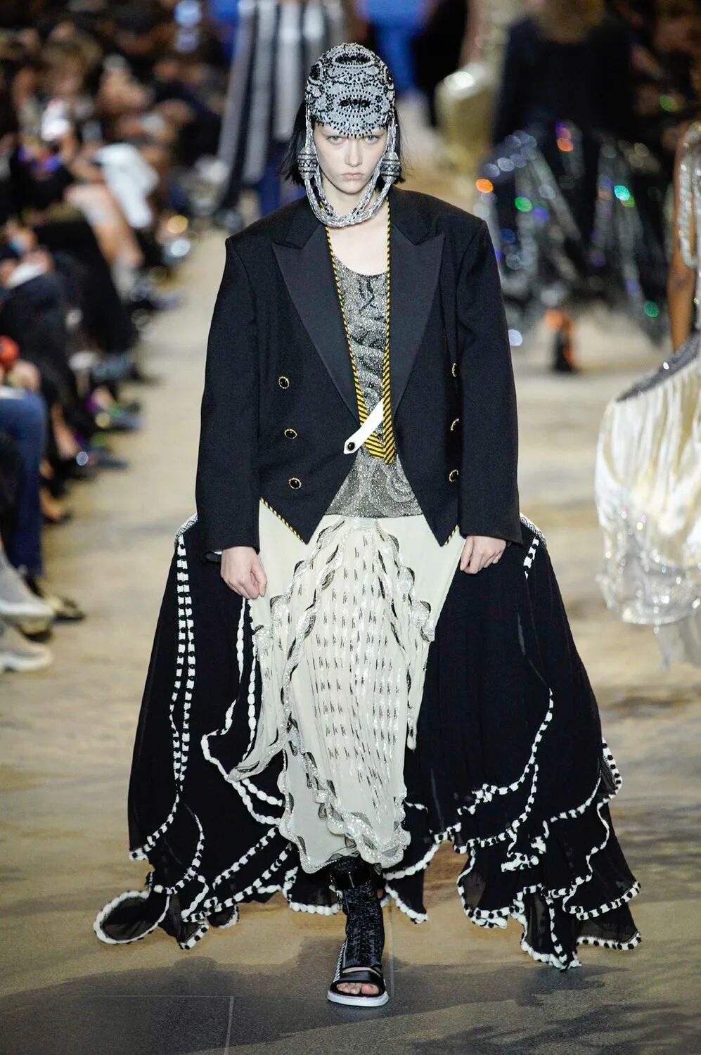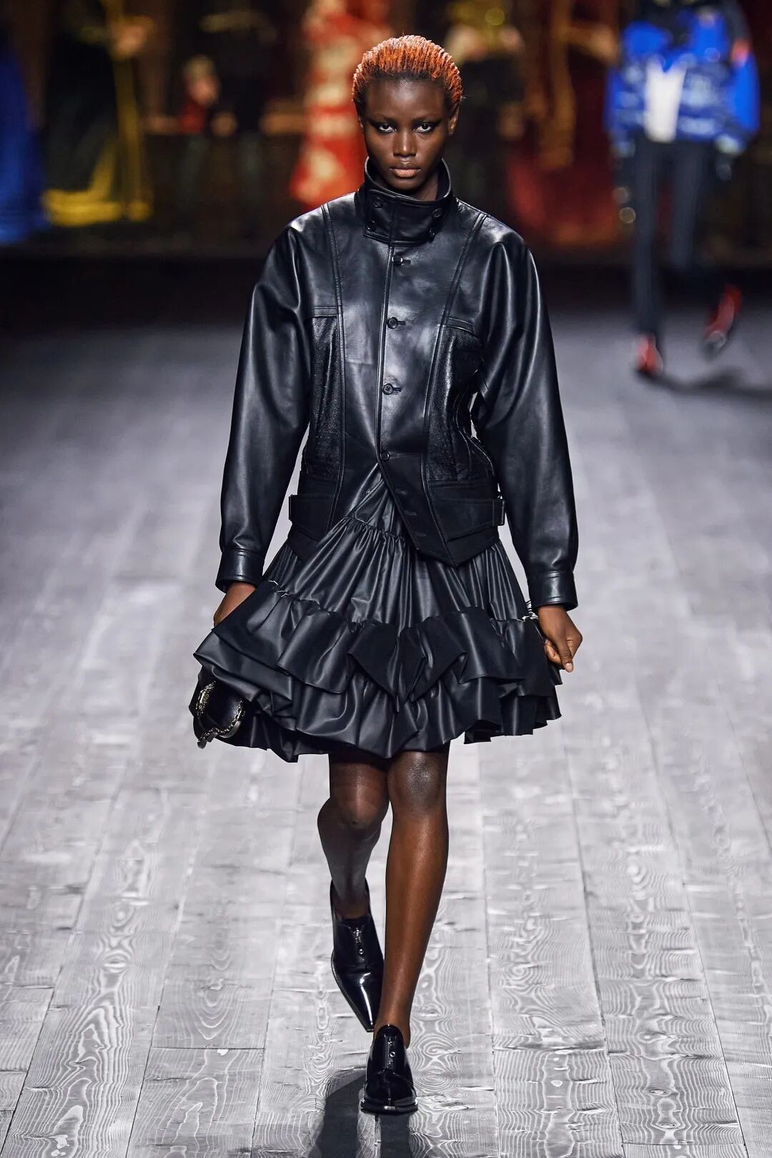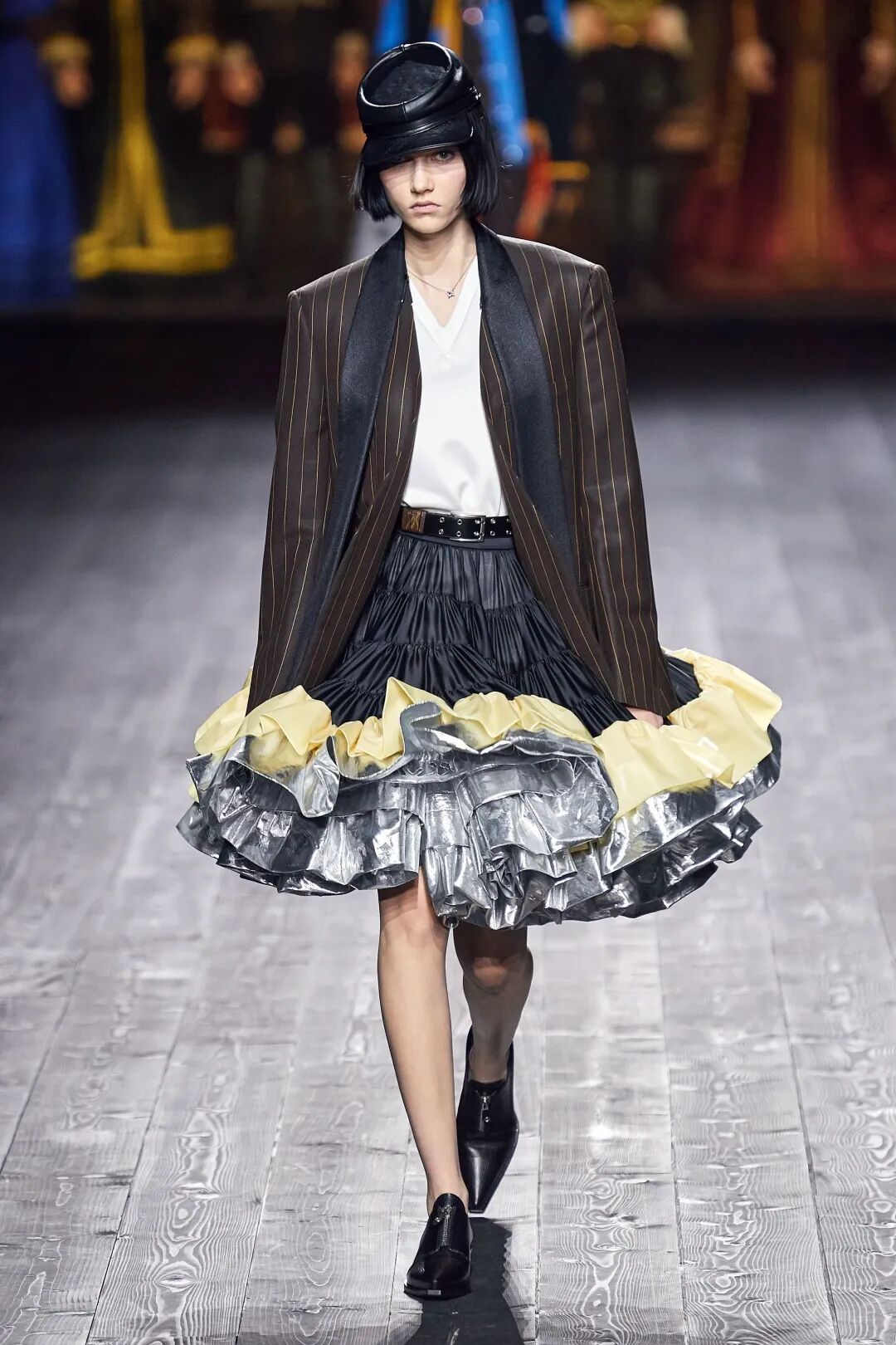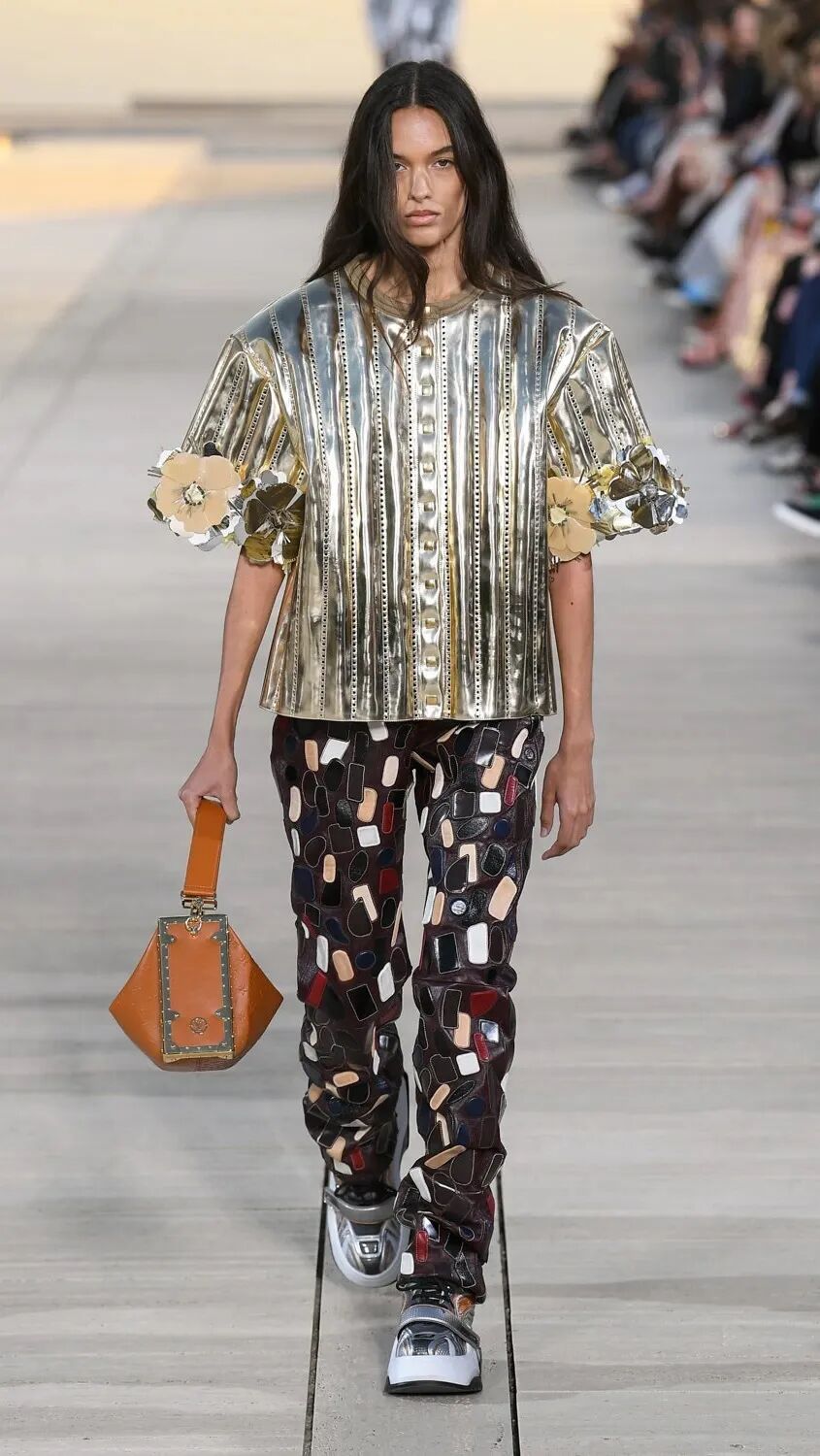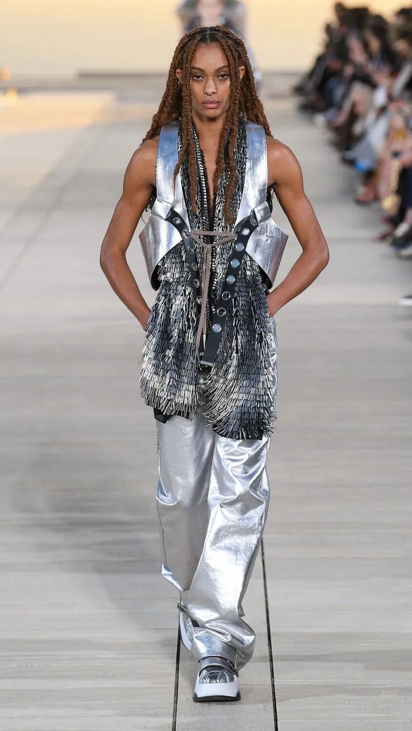 Nicolas Ghesquière 选择在傍晚时分开始此次大秀,将城市语言与建筑美学融合,充满未来主义的剪裁之上,透露着过往宫廷中华丽的美感。