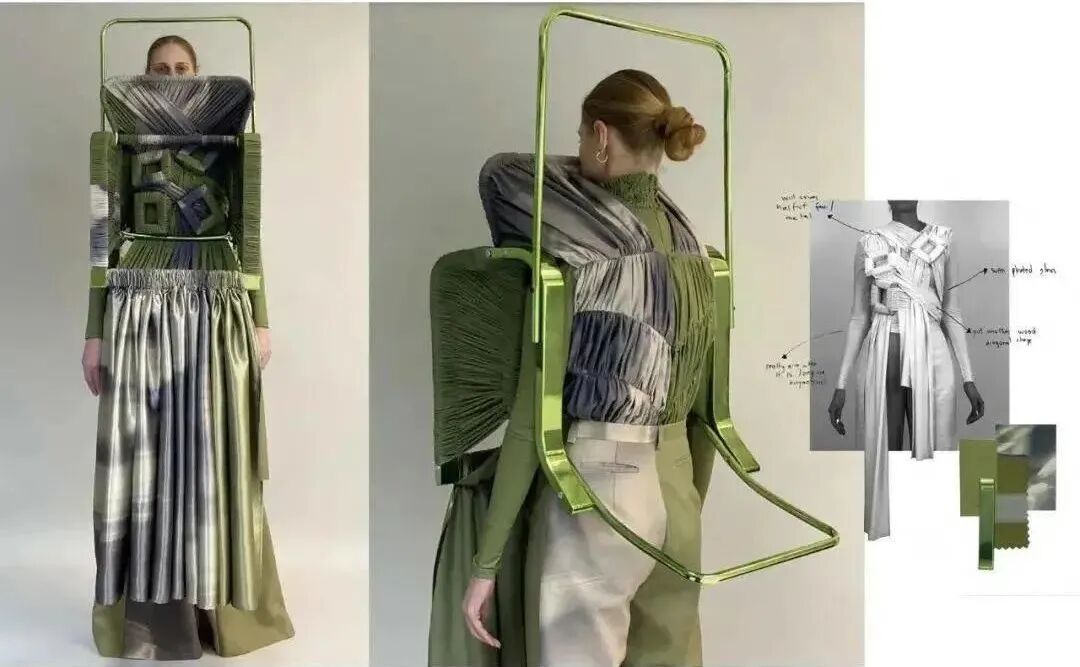 “每个人都有苦恼,面对痛苦最佳的办法是发现痛苦的美感,模特从椅子的每一个部位寻找出口,寓意着在痛苦中找到美感并把痛苦转变为成功与力量。“