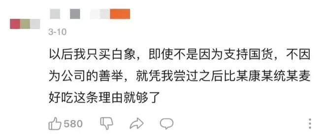 就像这位网友说的,“我买白象,即使不因为支持国货,不因为公司的善举,就凭我尝过之后比某康某统某麦好吃,这条理由就够了。”