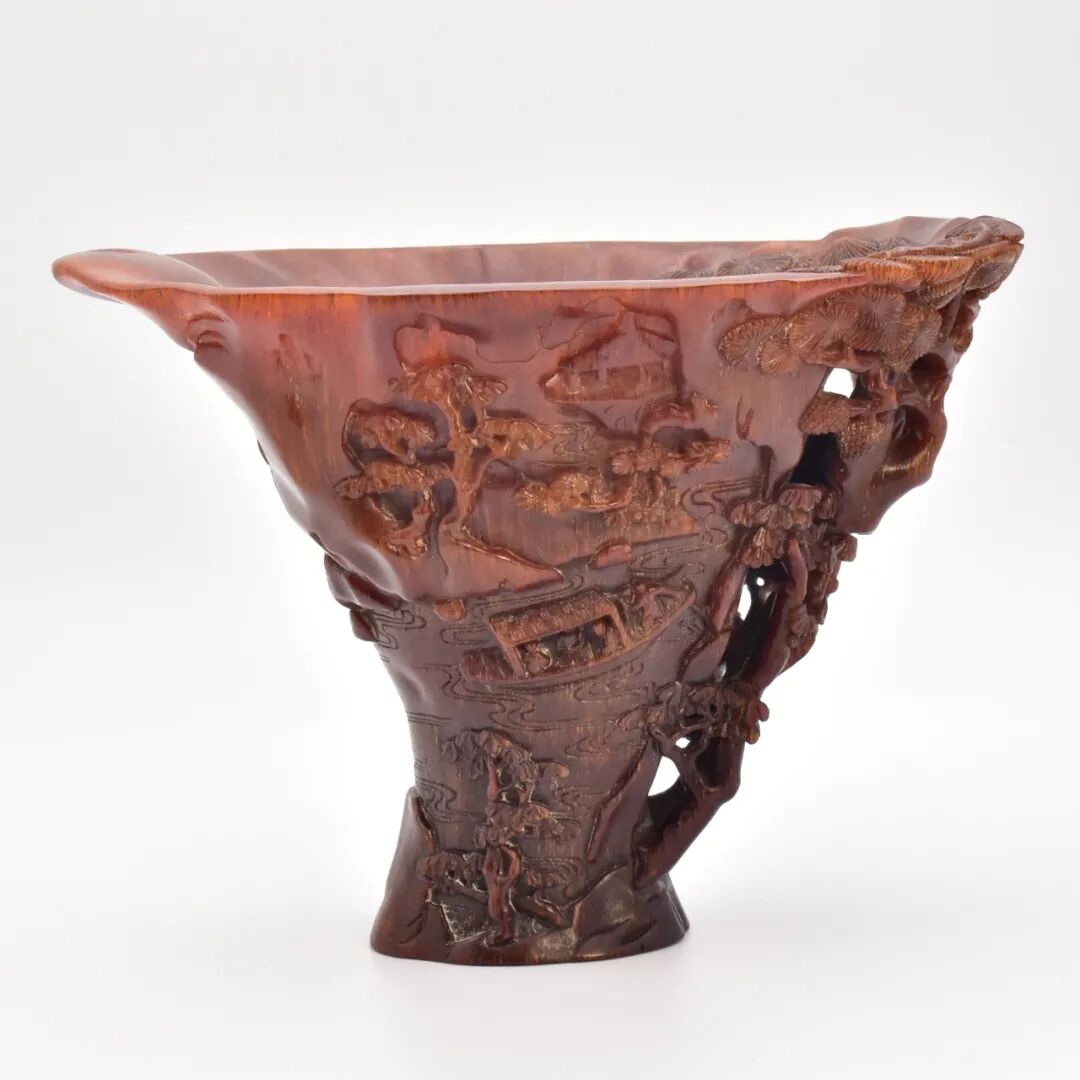 此件犀角杯以浅雕工艺方式,刻画出苏东坡与好友们同游赤壁的场景,对细节的刻画十分生动,是一件不可多得艺术精品。在历史的变迁中保留至今,实属难得。(犀牛为濒危野生物种,拍卖行不鼓励消费者购买新的犀牛角制品)。